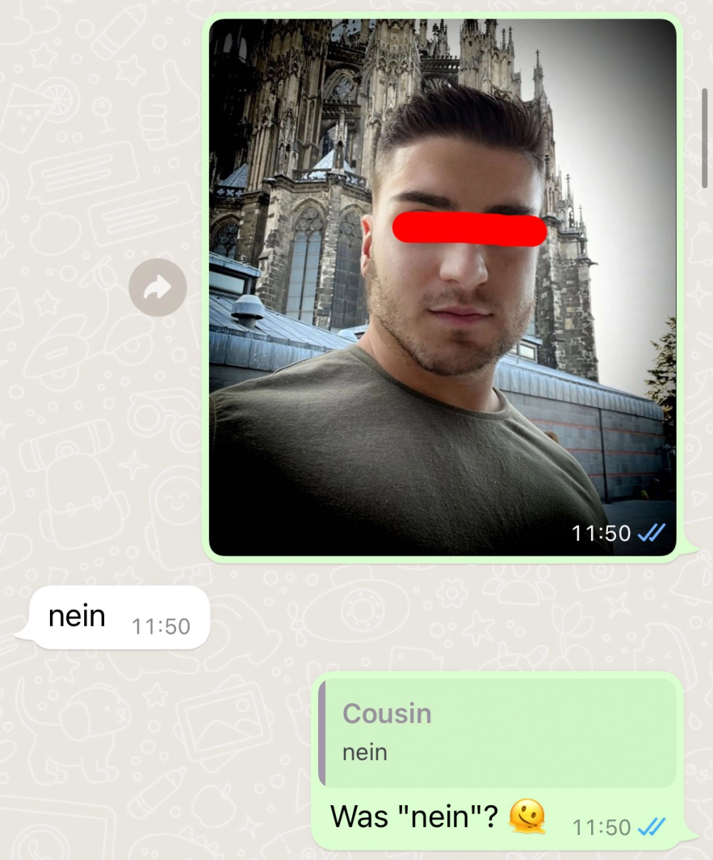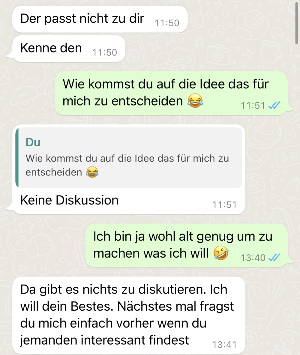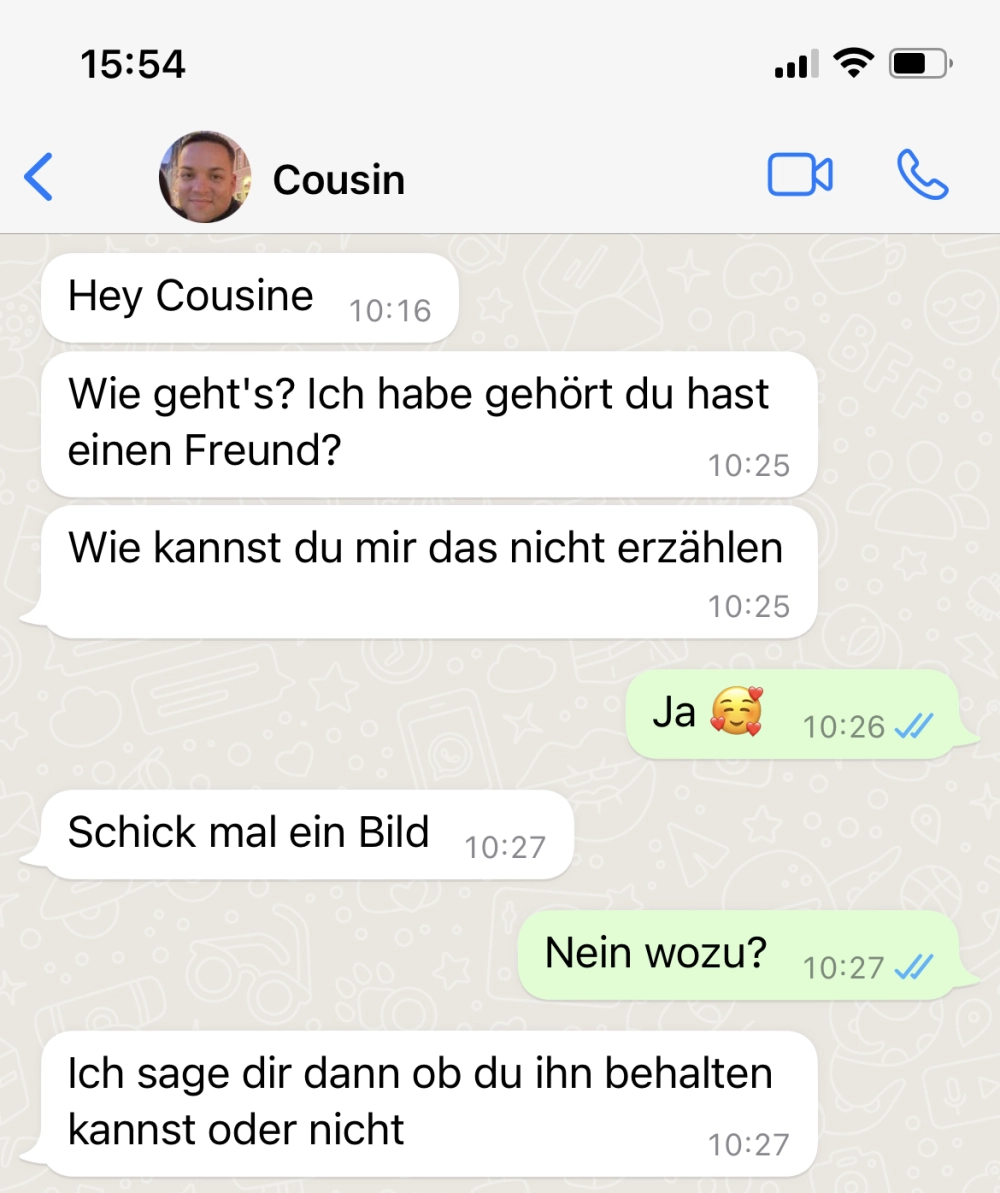 Der eigene Cousin will ihr Vorschriften machen Von donscap Veröffentlicht 09/05/2022, 2:04 PMDer eigene Cousin will ihr Vorschriften machenEr denkt auch, er kann sich alles erlauben :D aber so schnell kann sich das Blatt wenden.WhatsAppE-MailLink