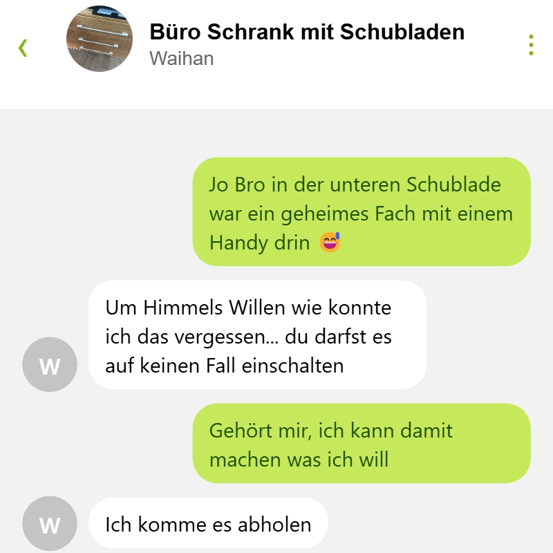 In dem Schrank war ein geheimes Handy Von donscap Veröffentlicht 02/26/2025, 2:50 PMIn dem Schrank war ein geheimes HandyGekauft wie gesehen, wie wie verhält sich das hier rechtlich? Die beiden sind da ziemlich unterschiedlicher Meinung 😂WhatsAppE-MailLink