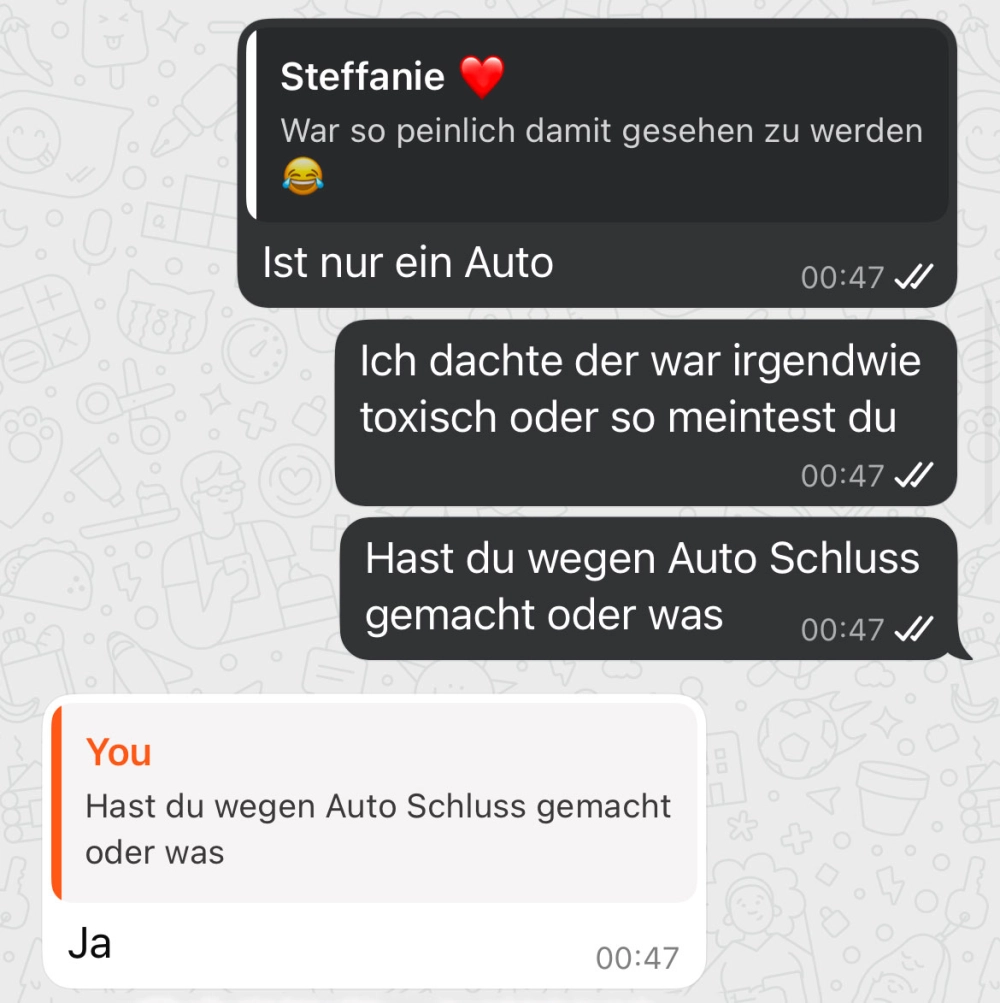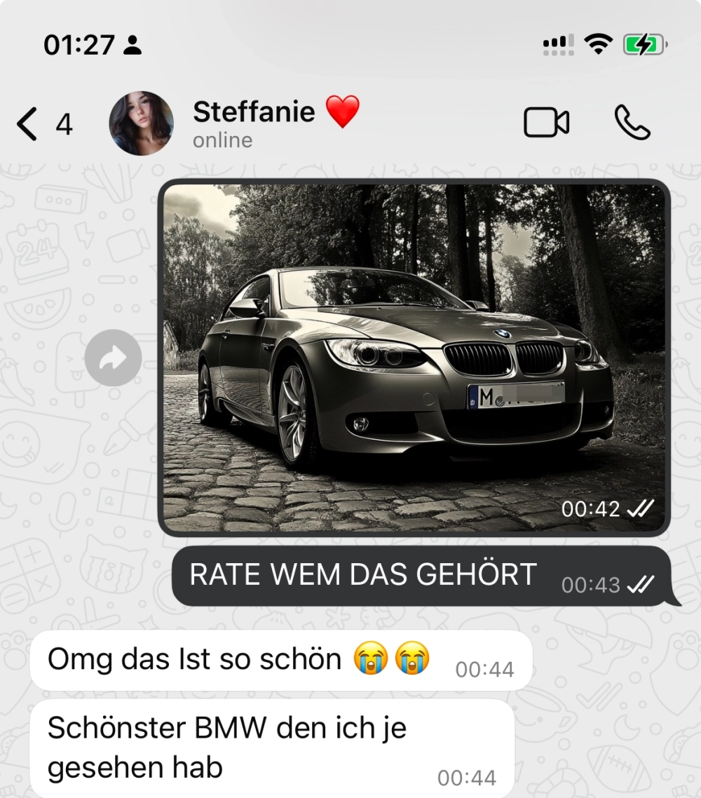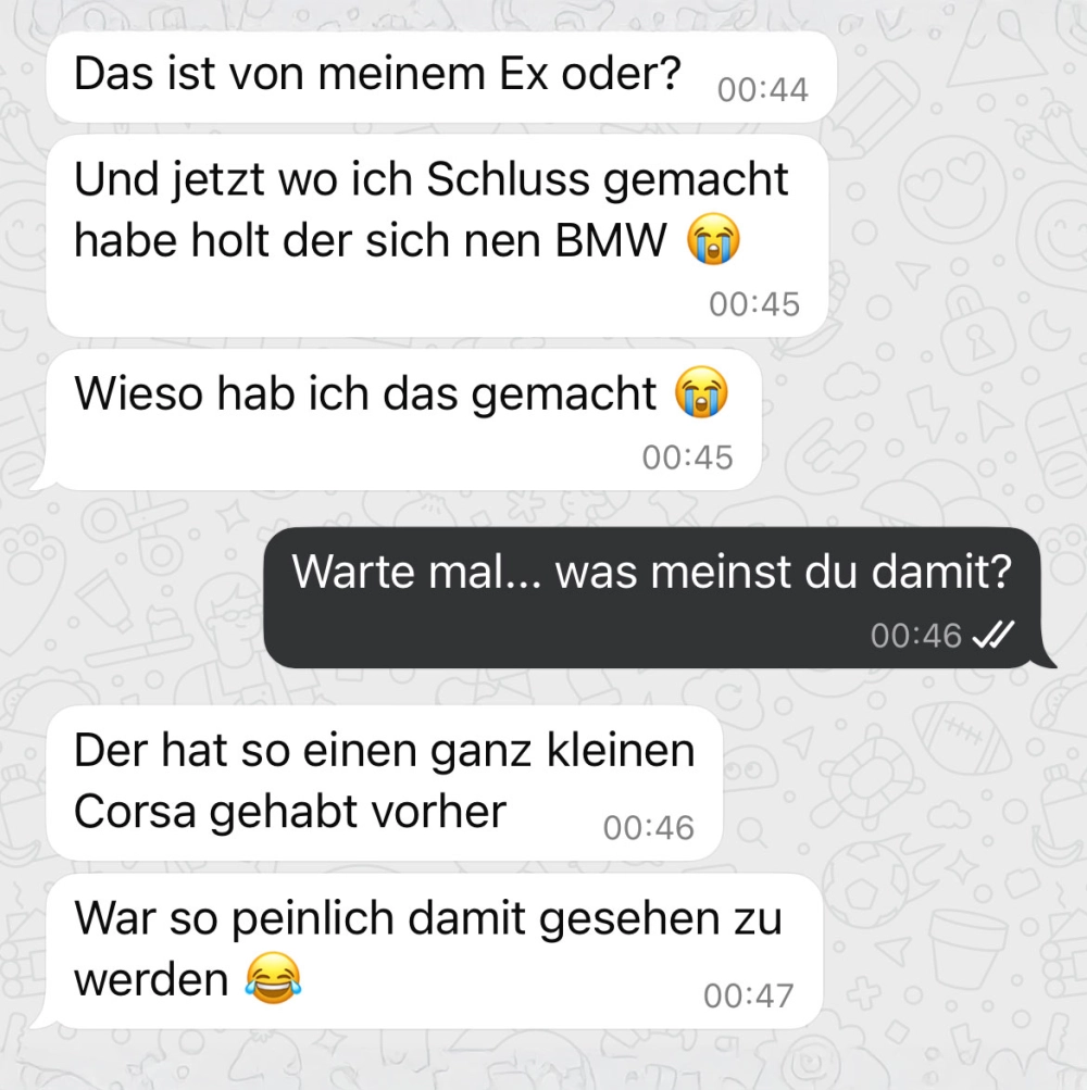 Ein Chatverlauf sorgt für Gesprächsstoff: Eine Frau schwärmt von einem BMW – bis sie erfährt, dass er ihrem Ex gehört. Plötzlich die Erkenntnis: „Und jetzt, wo ich Schluss gemacht habe, holt der sich nen BMW 😭 Wieso hab ich das gemacht?“
