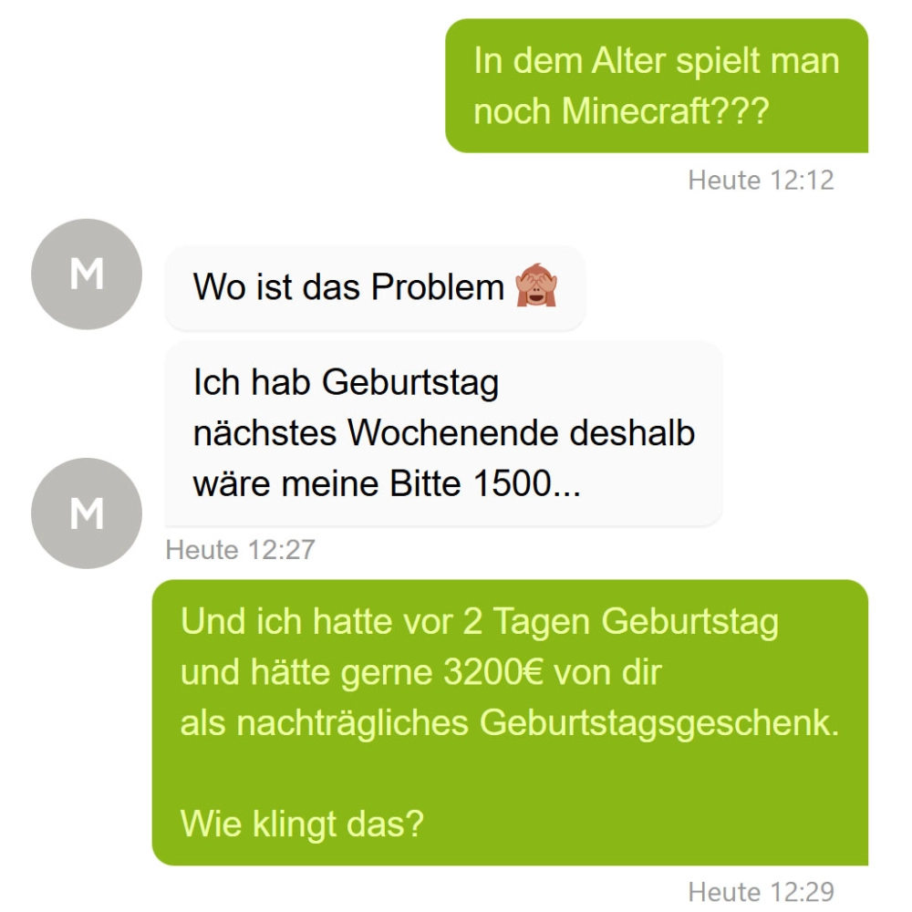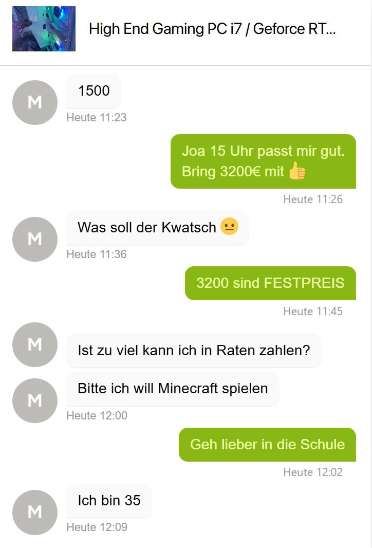 3200€ für einen Gaming PC mit i7 Prozessor, RTX Grafikkarte & High End Ausstattung – doch der Interessent will handeln. Es wird lange diskutiert: Hardware, Aufrüsten, Leistung, Grafikkarte, Prozessor, Gaming & Minecraft mit 35 Jahren immer noch ein wichtiges Thema 🤣