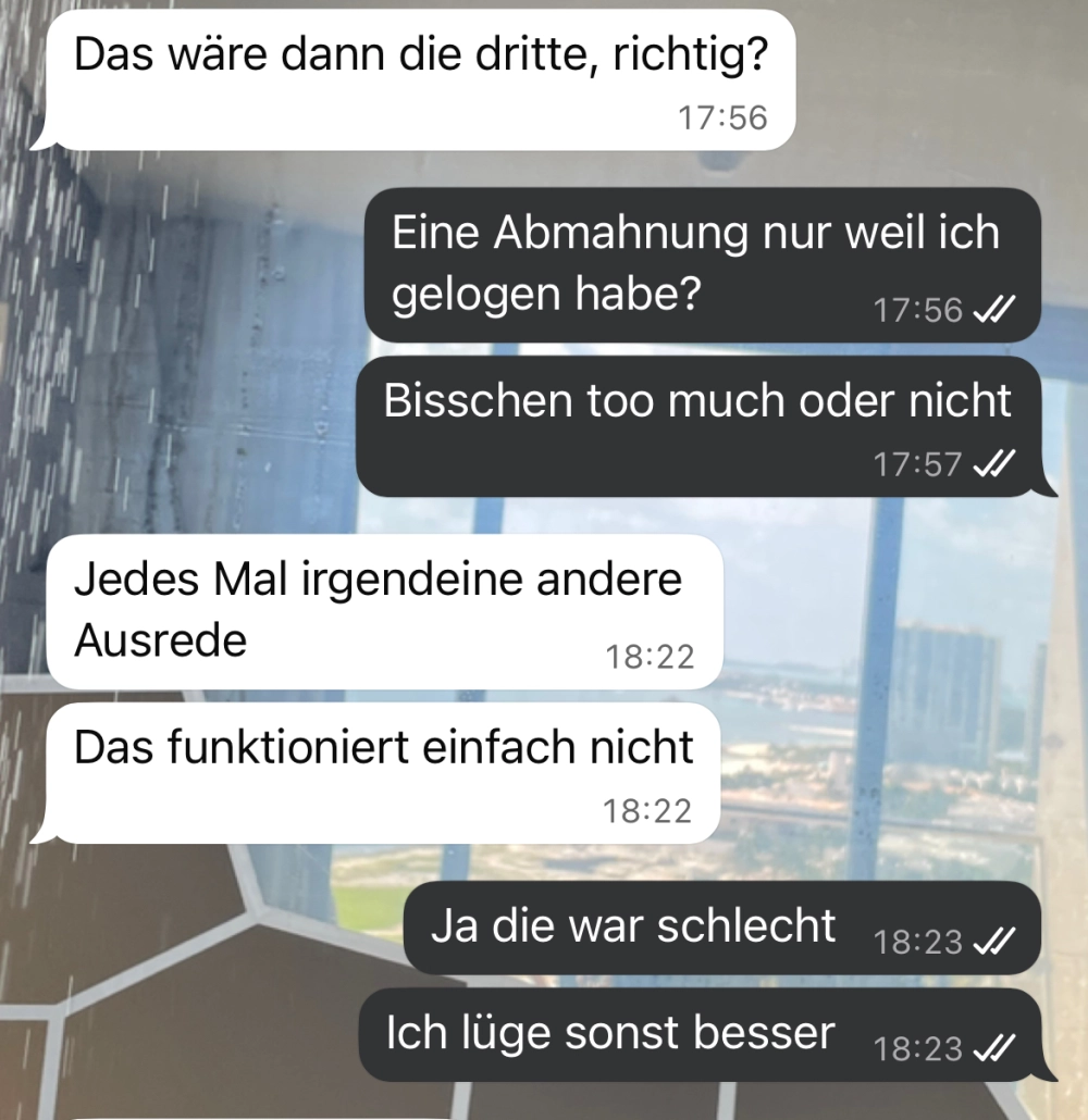 Dieser Chat zeigt perfekt, wie schnell eine Lüge im Job auffliegen kann. Zwischen Versicherung, Schaden, Arbeitsschutz und den echten Kosten eines Unfalls wird klar: Ehrlichkeit hätte hier wohl weniger Ärger gebracht. Doch immerhin hat in das zu einem neuen Lebensabschnitt motiviert 🤣