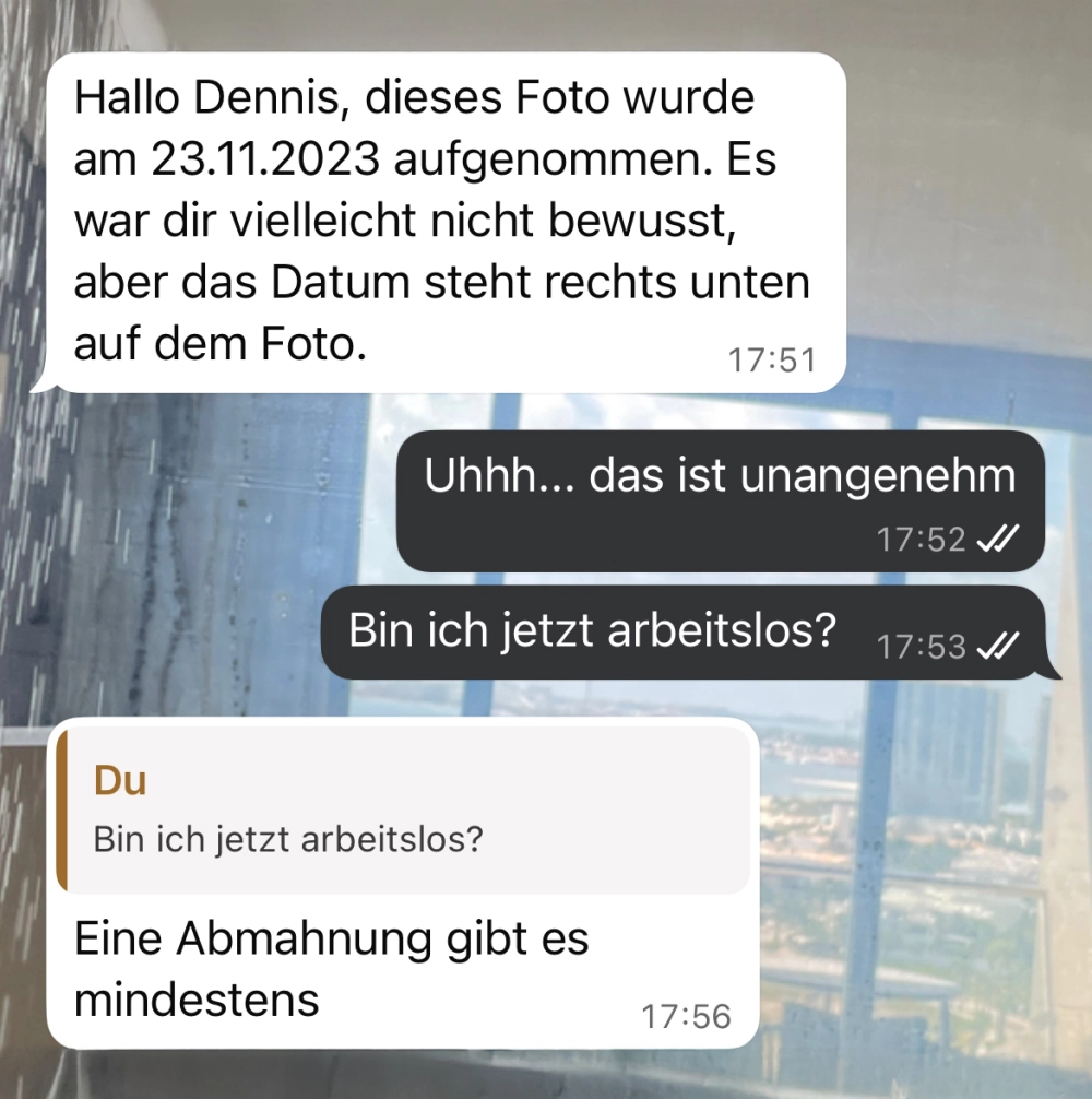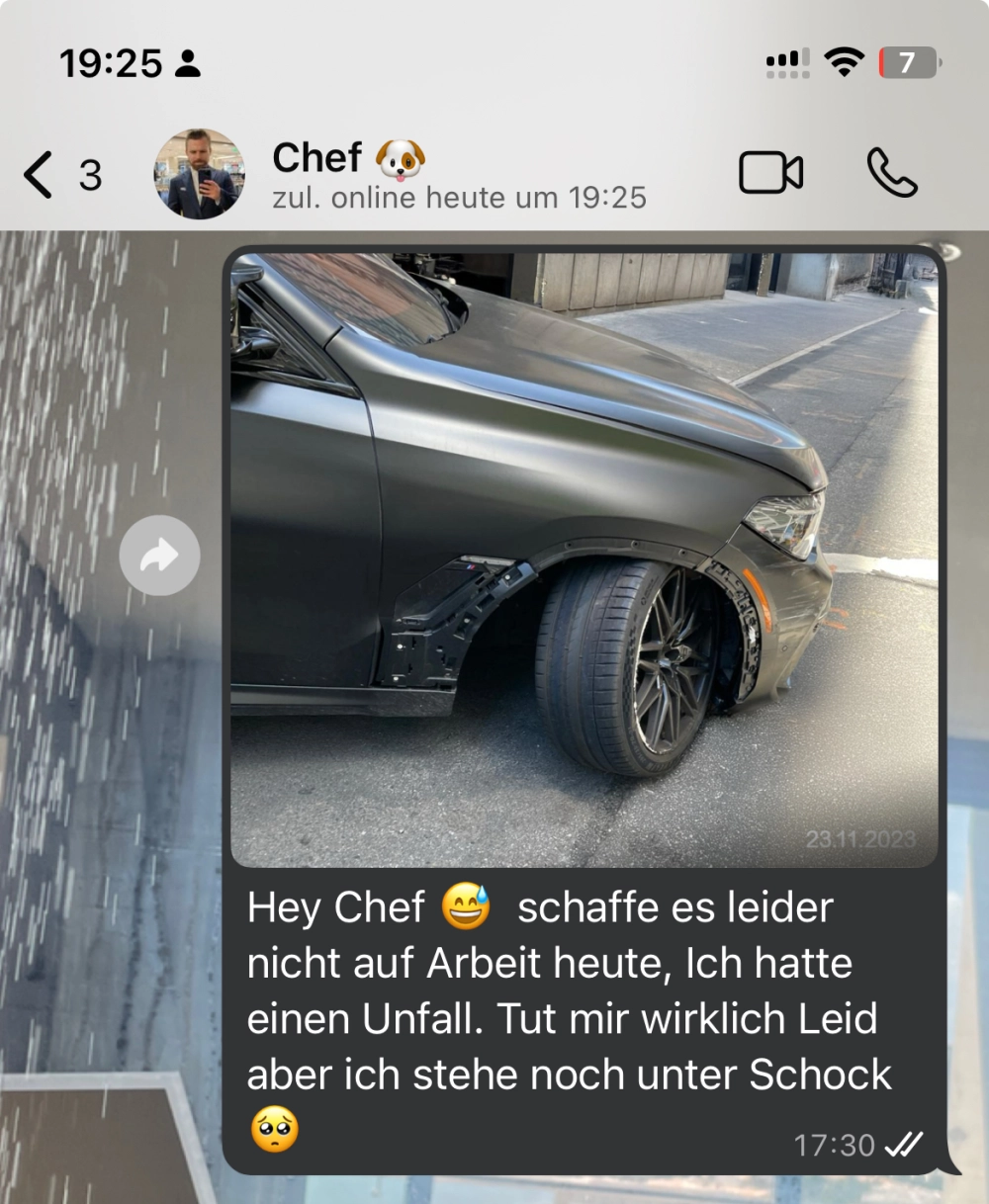Ein Mitarbeiter meldet sich mit der Ausrede eines Autounfalls krank – suboptimal nur, dass auf dem Foto das Datum eingeblendet ist. 🤯