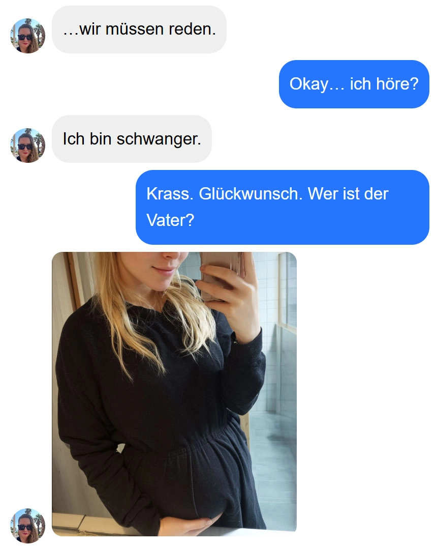 Eigentlich ein Grund zur Freude, jedenfalls wenn du damit rechnest und ein Kind willst. Er ist ja nicht mal der Vater und muss da durch 🤣 Aber so einfach wird es dann am Ende doch nicht!