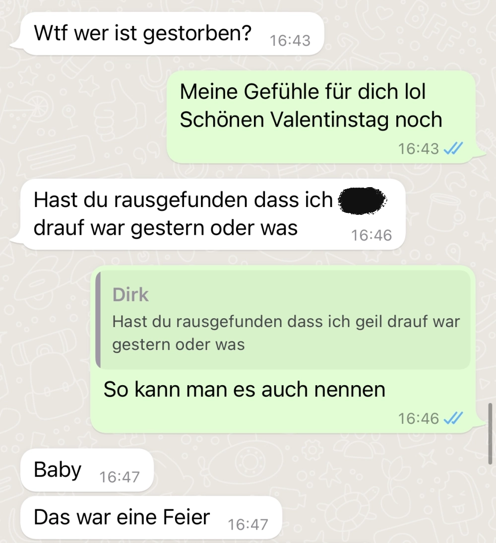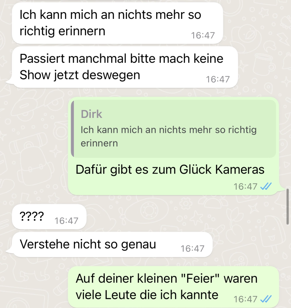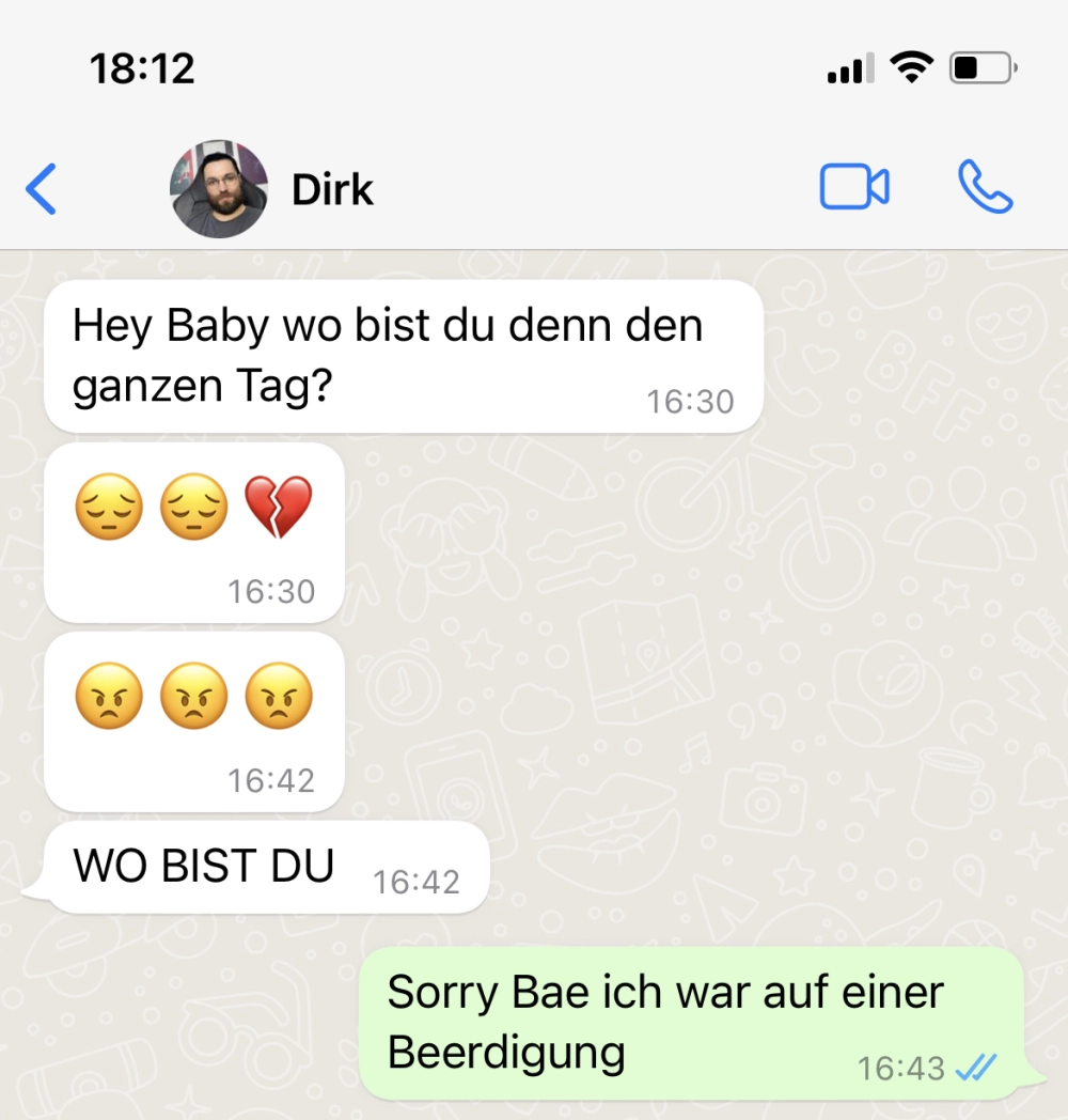 Auch eine nette Art und Weise ihn darauf vorzubereiten, dass alles vorbei ist 😂 doch so ganz will er es wohl nicht verstehen. Respekt, dass sie das am Ende noch durchgezogen hat, auch wenn es etwas anders lief.