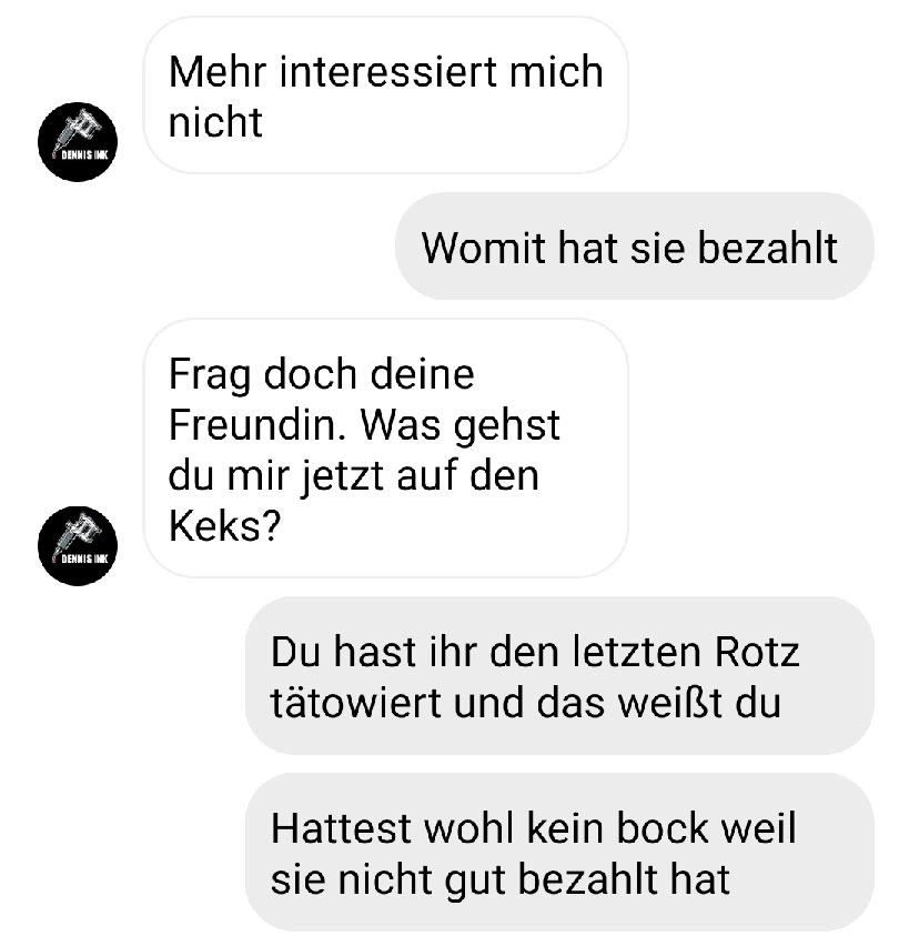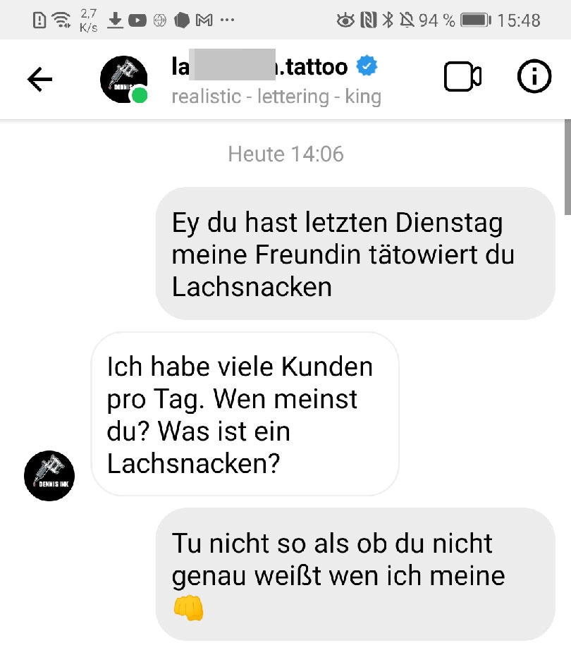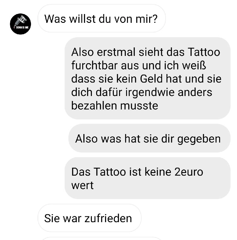 Offenbar hatte sie gar nicht genug Geld für ein neues Tattoo und musste auf eine "andere" Art und Weise dafür zahlen. Das hat der Freund jetzt herausbekommen und schreibt den Tätowierer mal selbst an. Aber nicht nur das, er zerstört eigentlich sein ganzes berufliches Leben. Verdient!