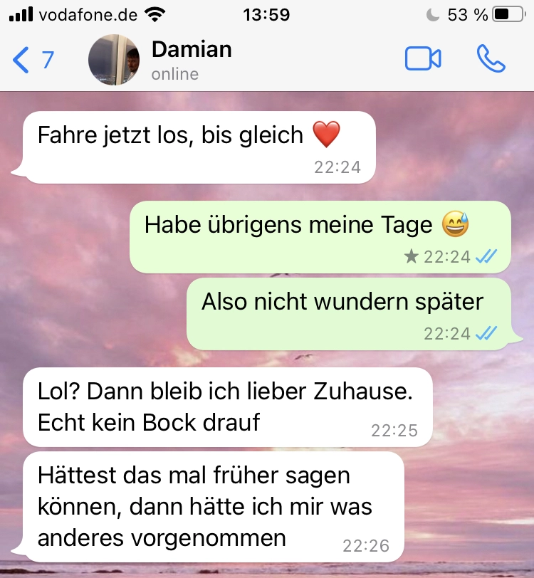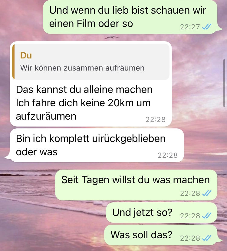 Er will den Kontakt abbrechen nur aus einem Grund Von donscap Veröffentlicht 15.03.2022, 13:37Er will den Kontakt abbrechen nur aus einem GrundAlso erwachsener Mann sollte man echt erwarten, dass er sich ein wenig anders verhält. Nehmt euch an ihm kein Beispiel, denn das geht absolut nicht klar!Tags:chatWhatsAppE-MailLink