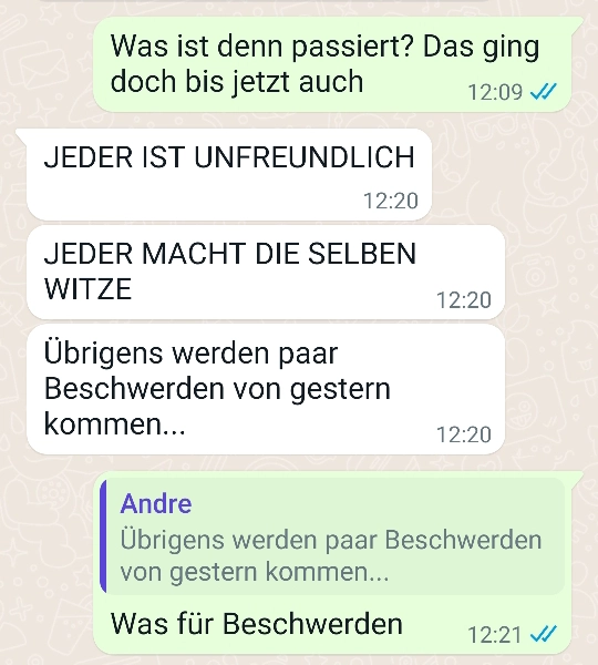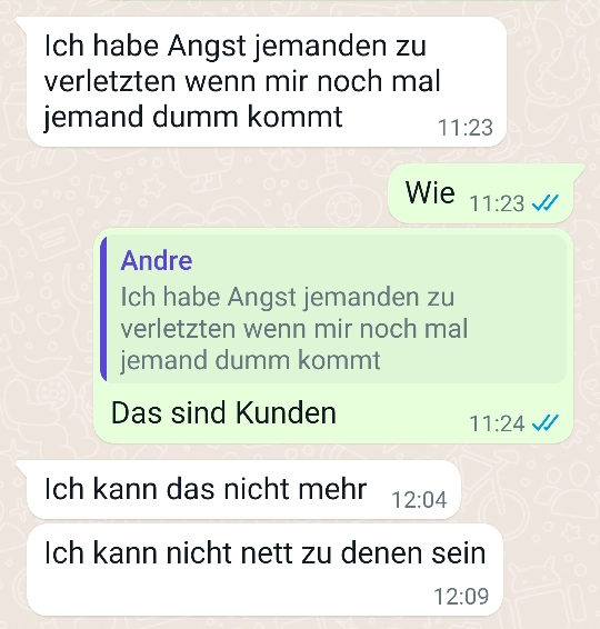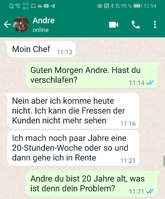 Andre hat echt kein Bock mehr auf Arbeit Von donscap Veröffentlicht 23.03.2022, 12:06Andre hat echt kein Bock mehr auf ArbeitUnd er hat einen ziemlich kreativen Weg gefunden, da nicht mehr auftauchen zu müssen. Aber er hat nicht mit der Reaktion seines Chefs gerechnet 😂😂Tags:chefWhatsAppE-MailLink