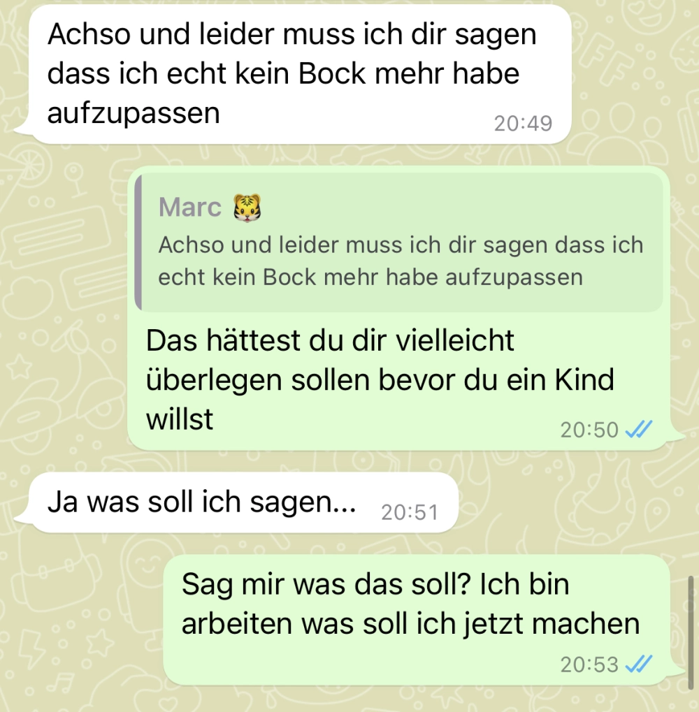 Wenn man ein Kind hat, dann hat man auch Verantwortung. Was hat sie sich nur gedacht, als sie ein Kind mit diesem Typen gemacht hat. Der ist ja selber noch nicht erwachsen (zumindest nicht im Kopf) - und jetzt muss sie es selber ausbaden.