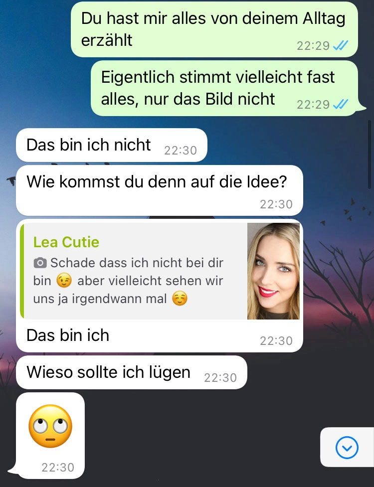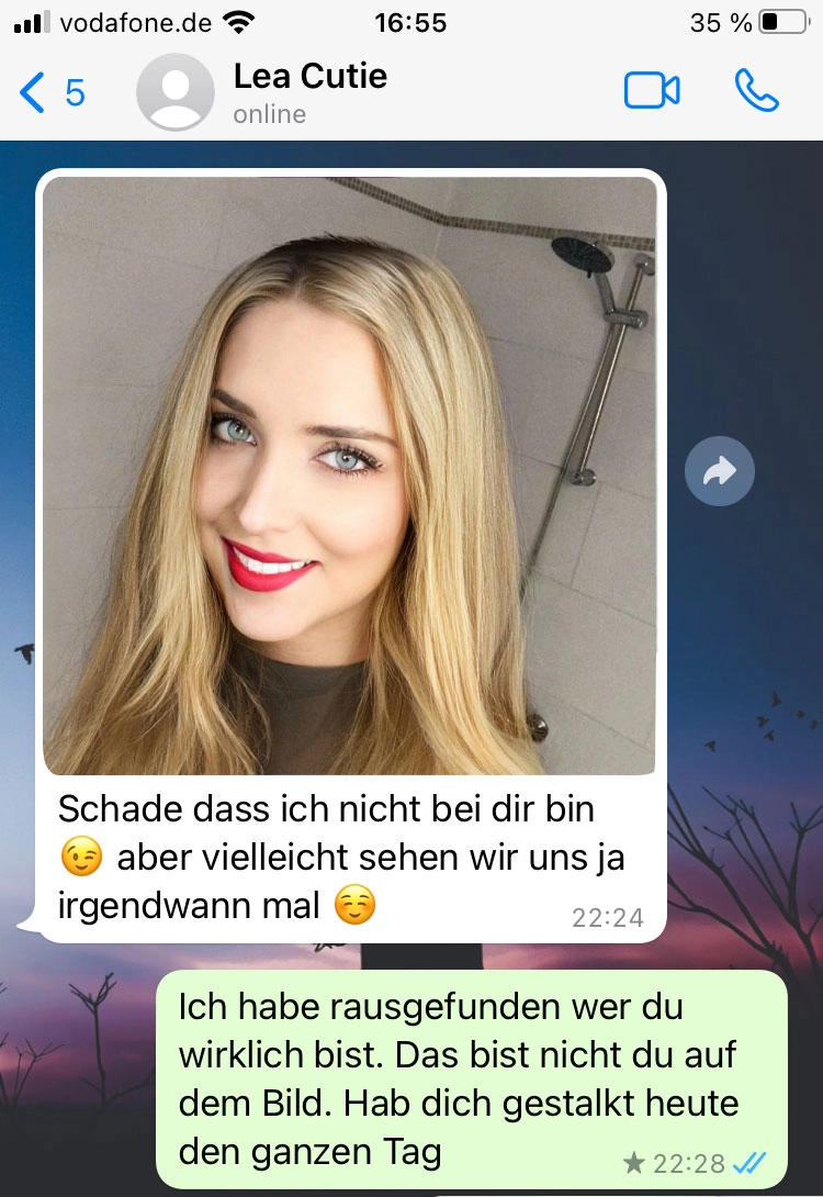 Er hat das echte Profilbild gefunden Von donscap Veröffentlicht 17.07.2022, 22:28Er hat das echte Profilbild gefundenLügen haben kurze Beine, das sollte man nie vergessen! Früher oder später kommt halt alles ans Licht. Obwohl die beiden irgendwie vielleicht zusammengepasst hätten...Tags:chatwhatsappWhatsAppE-MailLink