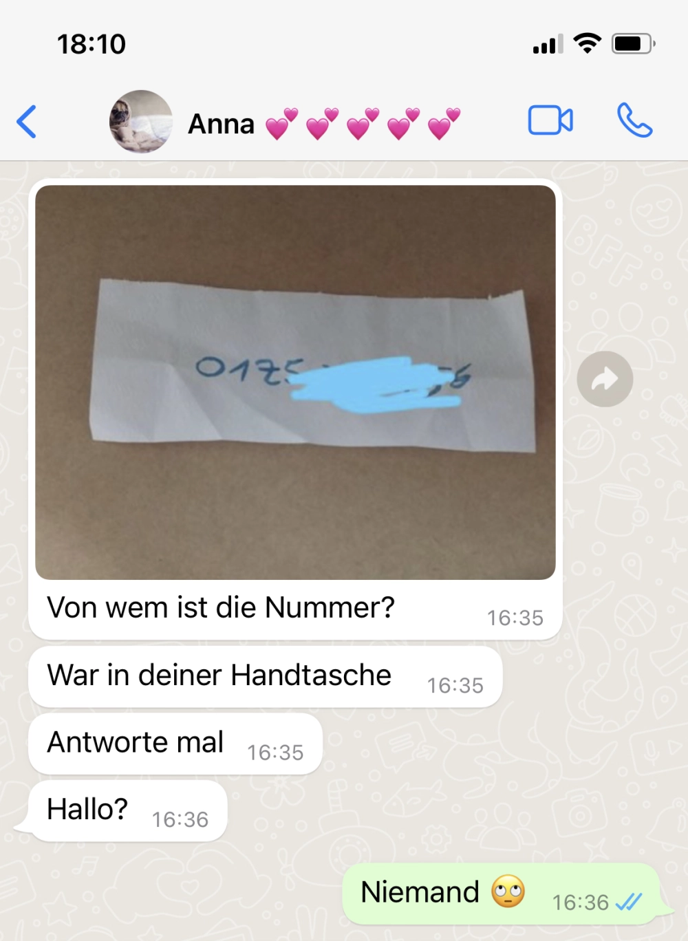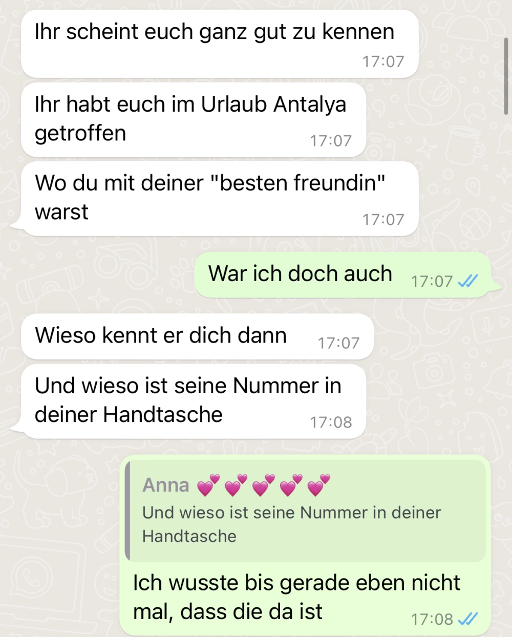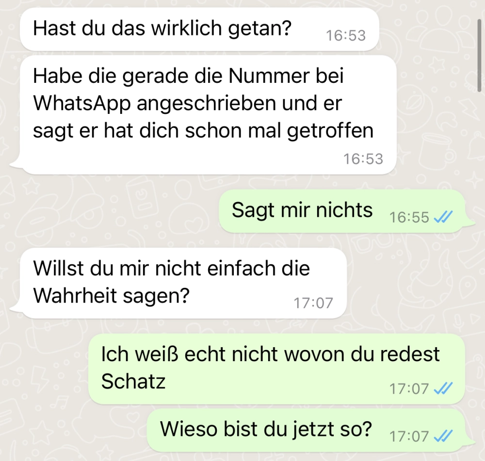 Vertrauen ist so wichtig Von donscap Veröffentlicht 05.08.2022, 16:30Vertrauen ist so wichtigIn einer Beziehung ist Vertrauen wohl das wichtigste. Wenn es 1x kaputtgegangen ist, wird es schwierig zu reparieren. Doch das hier entwickelt sich in eine ganz wilde Richtung 😂Tags:chatzettelurlaubWhatsAppE-MailLink