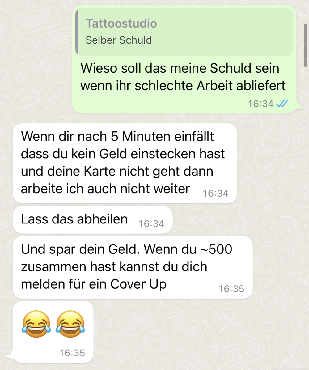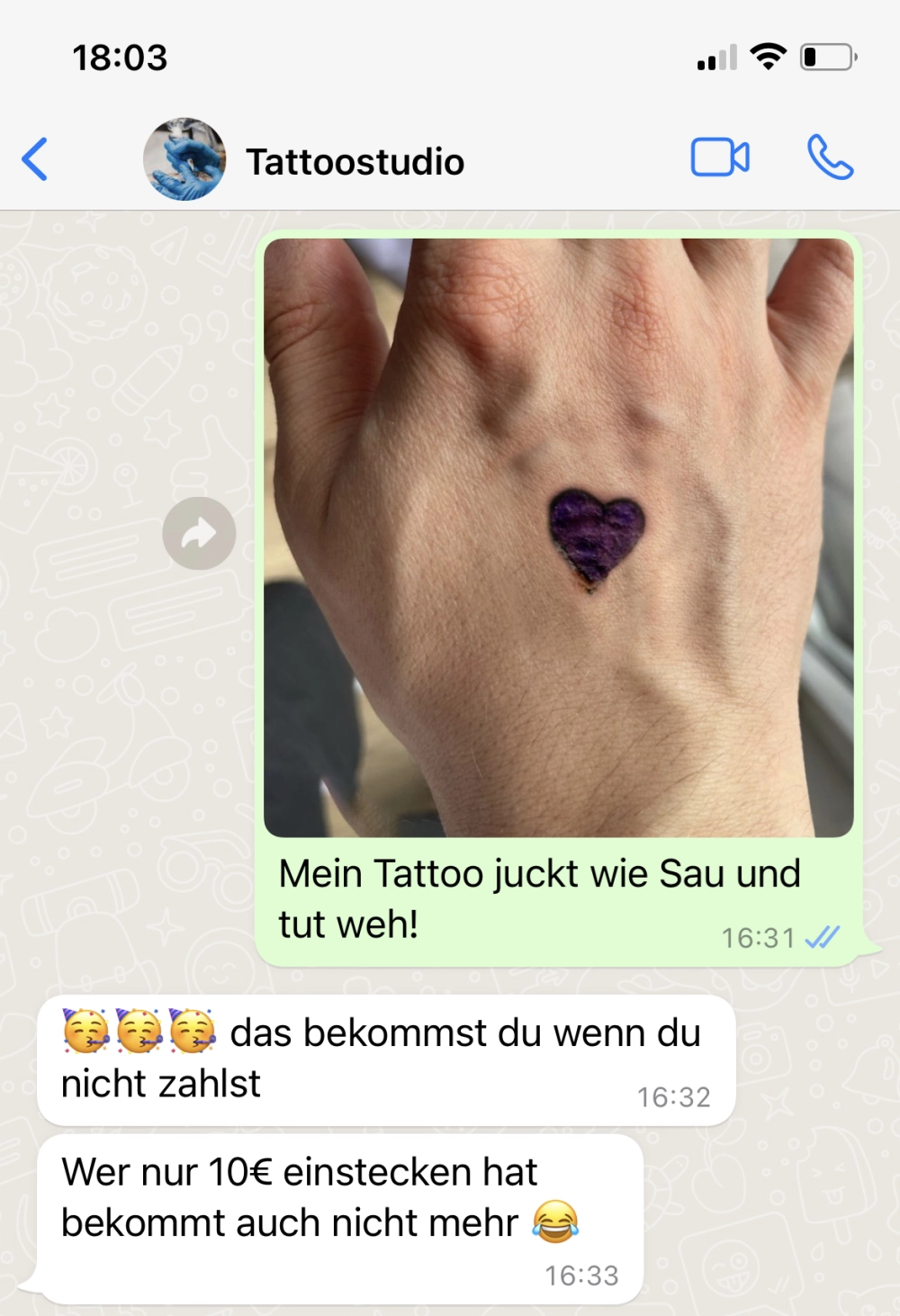 Das Herz sieht aber nicht gut aus Von donscap Veröffentlicht 13.08.2022, 16:23Das Herz sieht aber nicht gut ausEr hätte sich lieber ein anderes Tattoostudio aussuchen sollen. So sollte das sicher nicht aussehen 😐Tags:chatwhatsapptattooWhatsAppE-MailLink