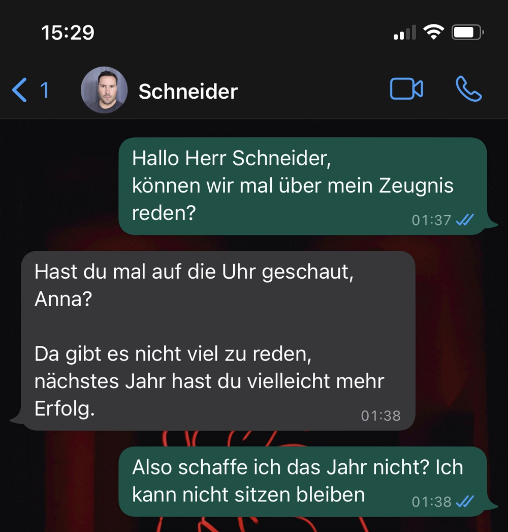 Sie wollte unbedingt bessere Noten Von donscap Veröffentlicht 07.09.2022, 13:43Sie wollte unbedingt bessere NotenDafür ist sie sogar erstaunlich kreativ geworden 😶 sie war so nah dran, ohne großen Aufwand dieses Schuljahr zu bestehen. Doch dann kam es anders als geplant.Tags:chatschuleWhatsAppE-MailLink
