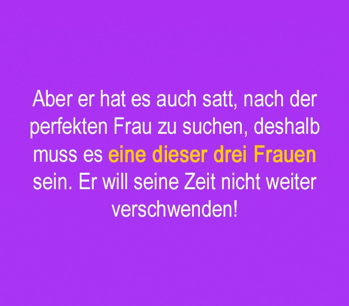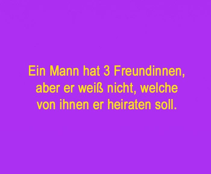 So suchen sich Männer ihre Frauen aus Von donscap Veröffentlicht 04.10.2021, 16:06 Aktualisiert 07.11.2021, 00:48Wenn Männer sich entscheiden müssen, haben sie es nicht leicht. Doch er hat die perfekte Methode gefunden um sich zu entscheiden! Also ich fand die eine so gut....Tags:witzfrauenmännerbeziehungtextWhatsAppE-MailLink