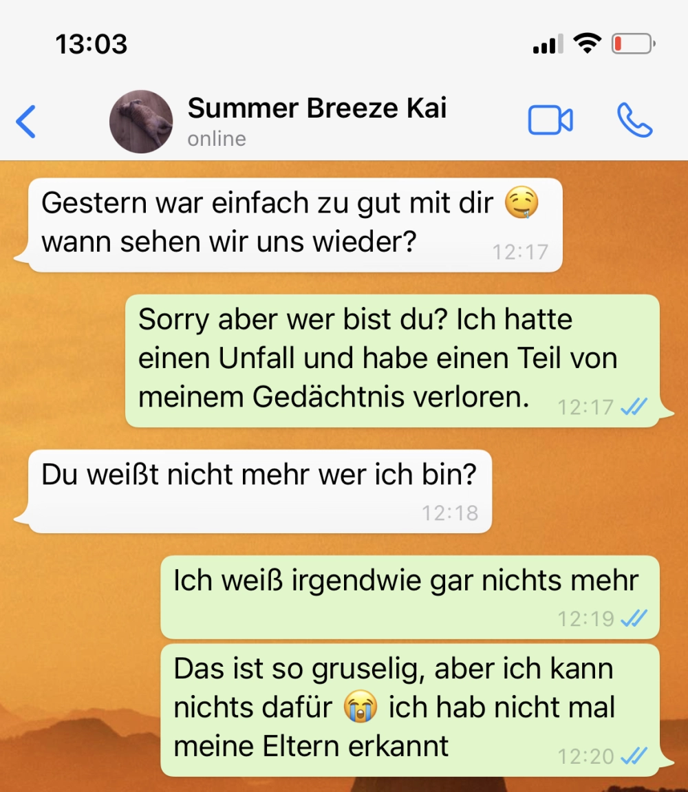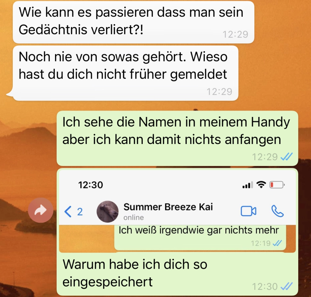 Sie hat ihr Gedächtnis verloren und weiß anscheinend gar nichts mehr. Doch dann gibt es noch ihn... Der Chatverlauf lässt mich den Glauben an die Menschheit verlieren.