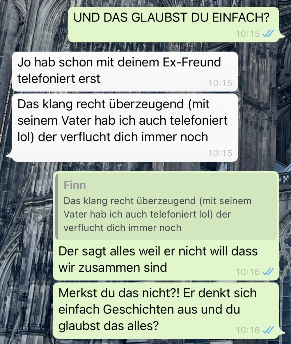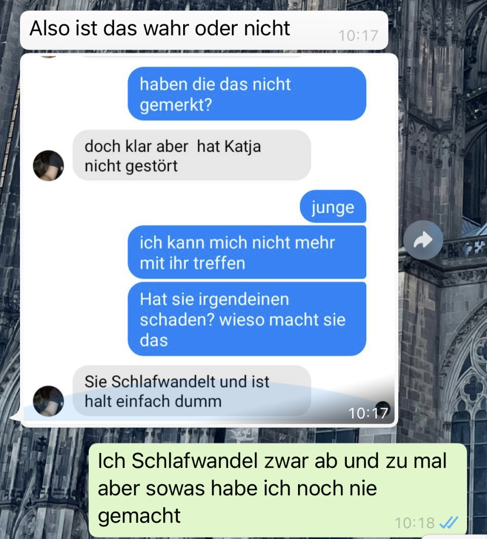 Wenn man schon von jemandem gewarnt wird, sollte man vielleicht erstmal zuhören. Aber man darf auch nicht vergessen, kritisch zu sein. Am Ende kommt sowieso alles ganz anders... der Chatverlauf ist zu wild 🤣