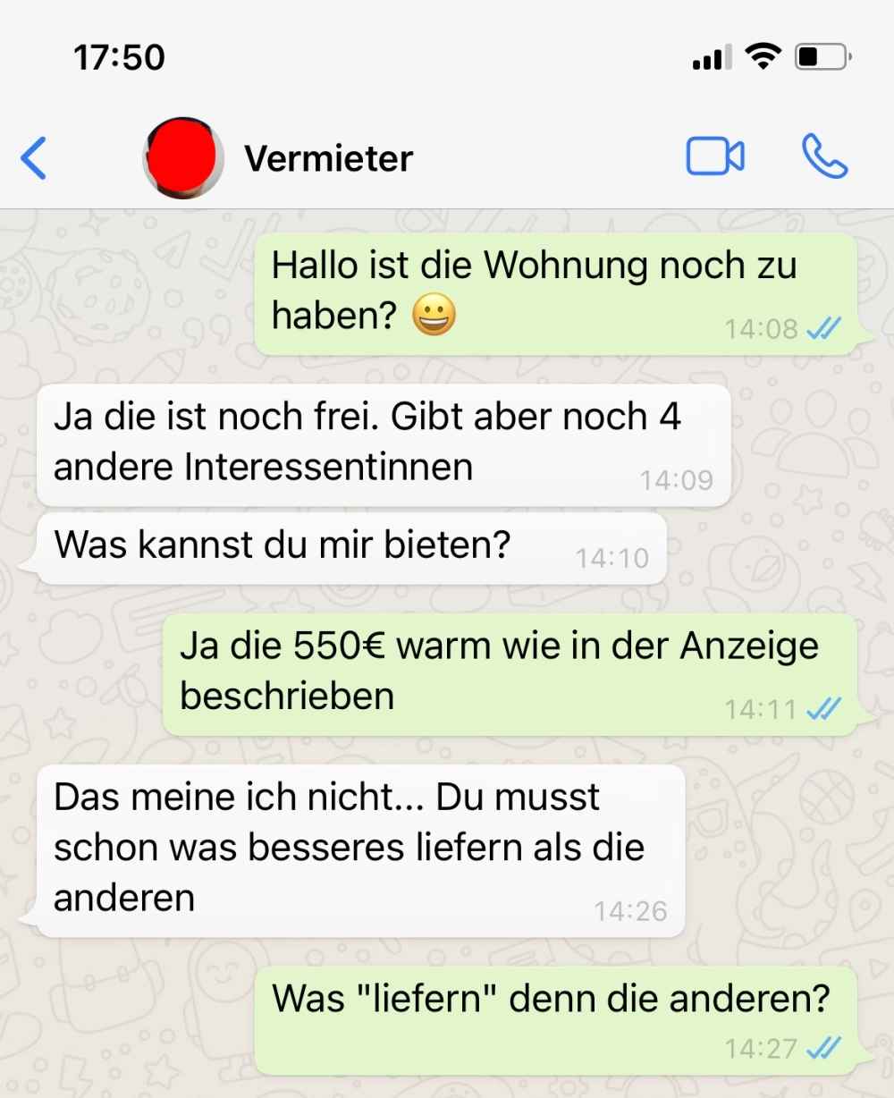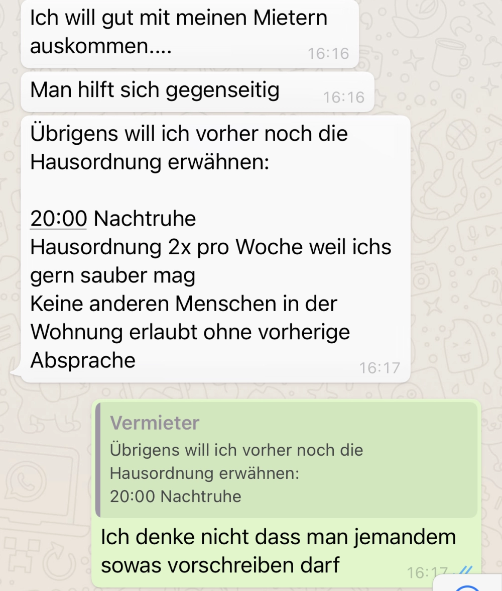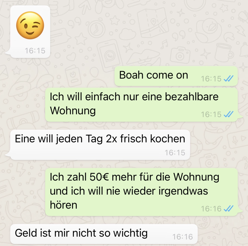 Sie wollte doch nur eine Wohnung, mehr nicht! Von donscap Veröffentlicht 23.10.2021, 23:29 Aktualisiert 17.09.2025, 09:24Die Wohnungssuche heutzutage kann offensichtlich eine echte Qual sein. Ich hoffe, ihr trefft niemals auf solche Leute.Tags:chatvermieterohnungchatverlaufWhatsAppE-MailLink