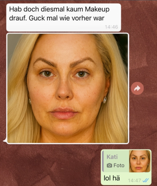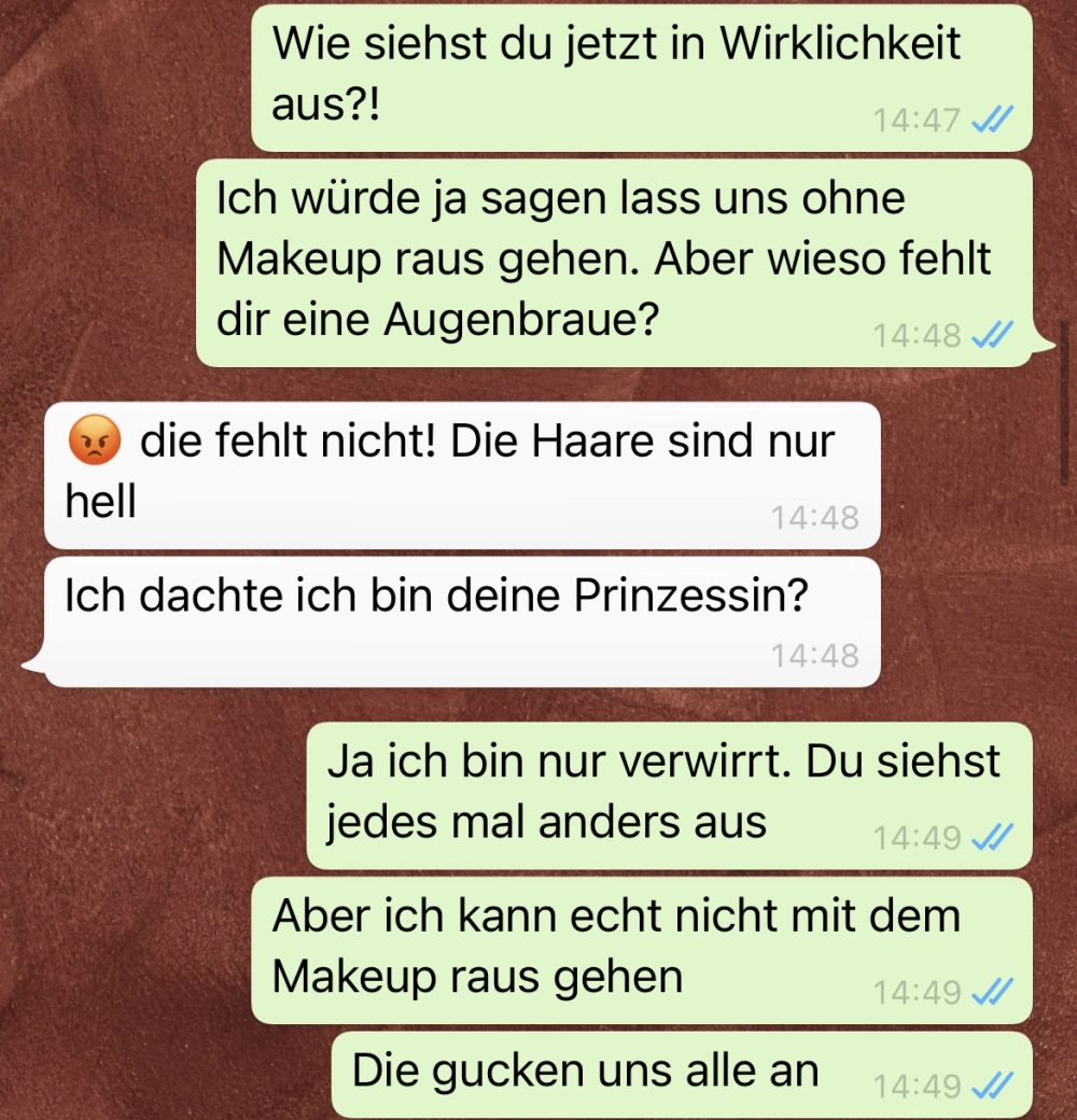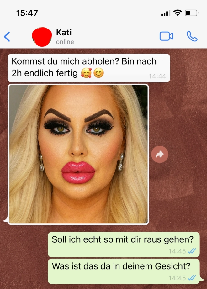 Makeup kann so viel ändern Von donscap Veröffentlicht 28.10.2021, 14:06 Aktualisiert 17.09.2025, 09:03Viele Männer mögen geschminkte Frauen, viele allerdings auch ungeschminkt. Doch die beiden haben sich wohl endlich gefunden. Das Ende kam dann doch überraschend!Tags:smshatverlaufchathatsappmakeupwhatsappWhatsAppE-MailLink