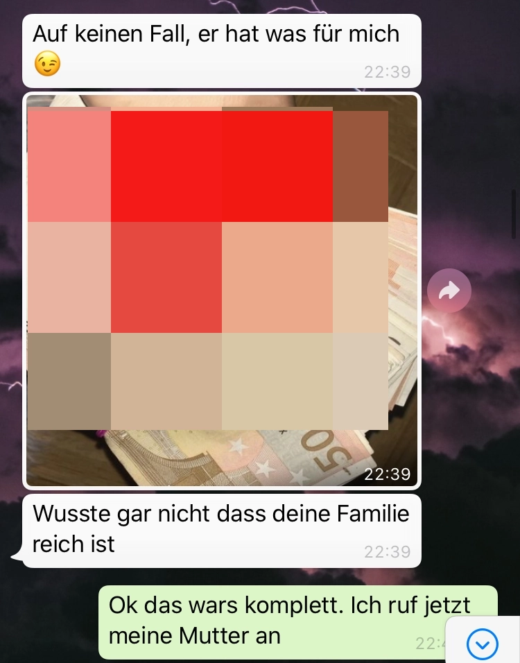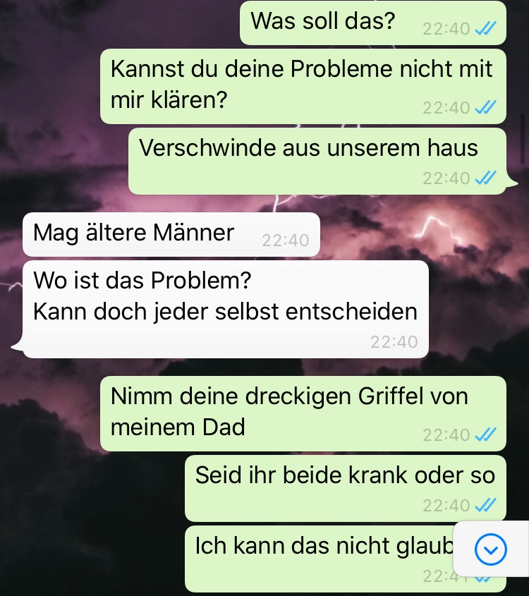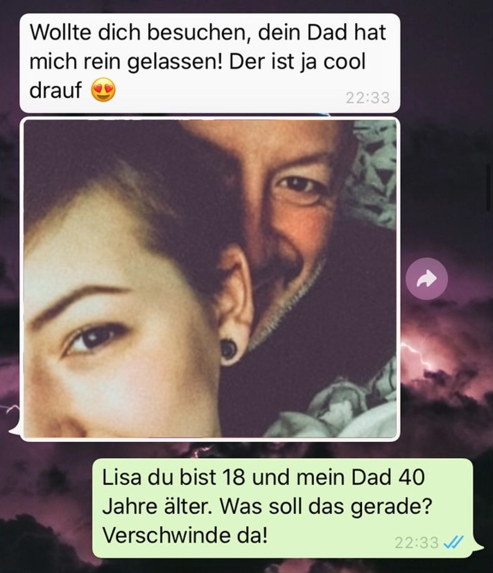 Wenn du eine Freundin hast, die Zuhause auf dich wartet und sie sich etwas zu gut mit deinem Vater versteht kommt sowas raus. Also 40 Jahre Altersunterschied sind schon enorm.