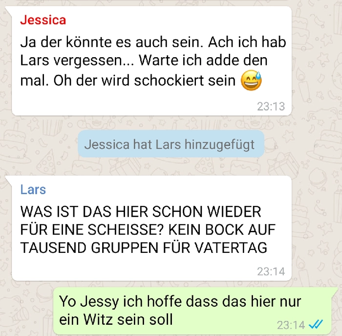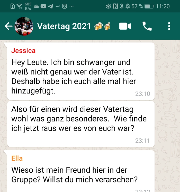 Jeder könnte der Vater seinV Von donscap Veröffentlicht 01.11.2021, 10:26 Aktualisiert 07.11.2021, 00:48Vatertag 2021 war für die Leute hier wohl etwas ganz besonderes. Mindestens einer von ihnen wird es auch die nächsten 18 Jahre nicht vergessen!Tags:schwnagergruppenchatwhatsappWhatsAppE-MailLink