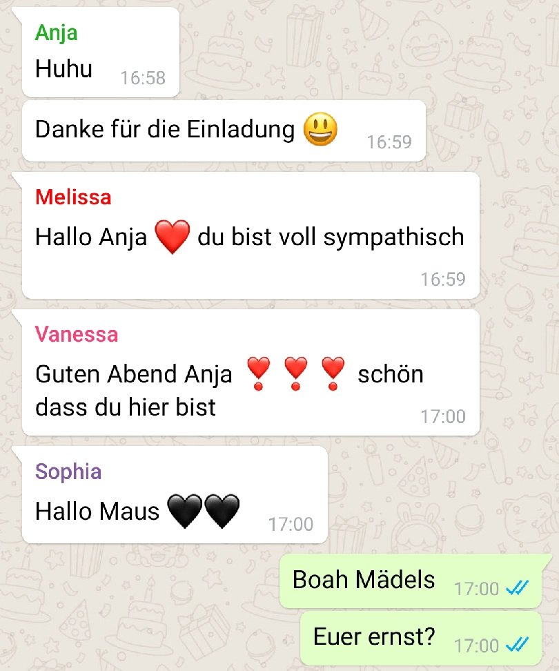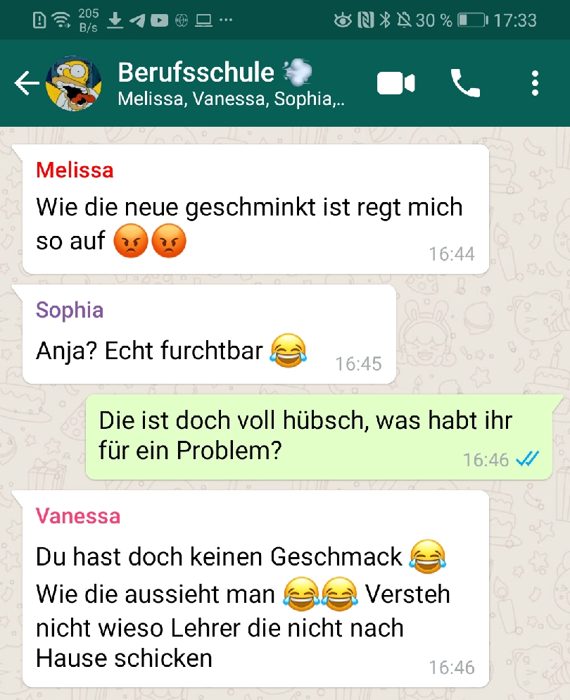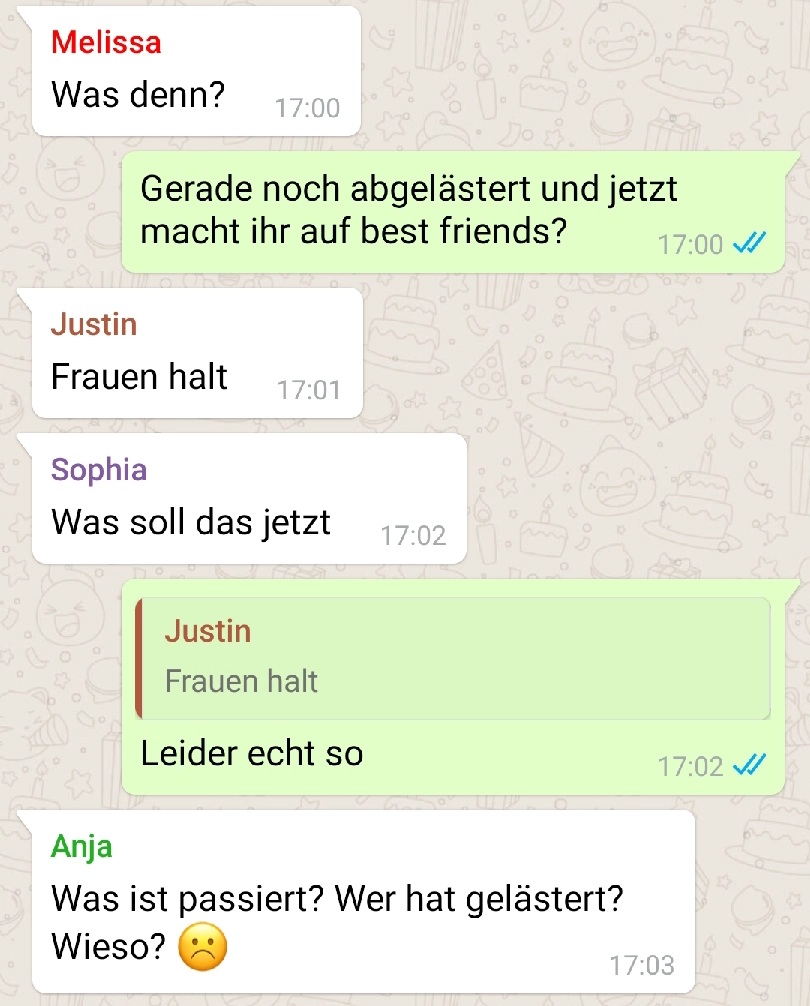 In einem Gruppenchat sind alle ehrlich - zumindest so lang bis die Person dabei ist, um die es geht. Hier kommen endlich mal die wahren Gesichter ans Tageslicht. Man kann nur hoffen, dass das nicht überall so läuft 😫