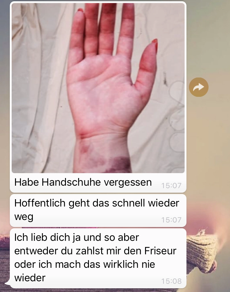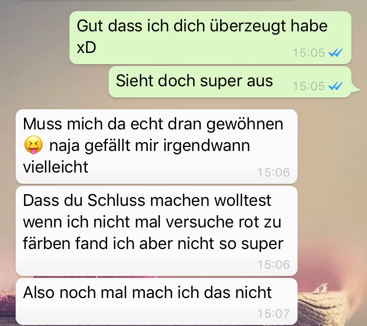 Die Haare sind ihr kleinstes Problem Von donscap Veröffentlicht 08.11.2021, 16:07Sie sollte sich wirklich mal Gedanken darüber machen, mit wem sie eigentlich zusammen ist. Der scheint ihr wirklich nicht gut zu tun. Da ist die Frisur das kleinste Problem!Tags:chatchatverlaufwhatsappfrisurWhatsAppE-MailLink