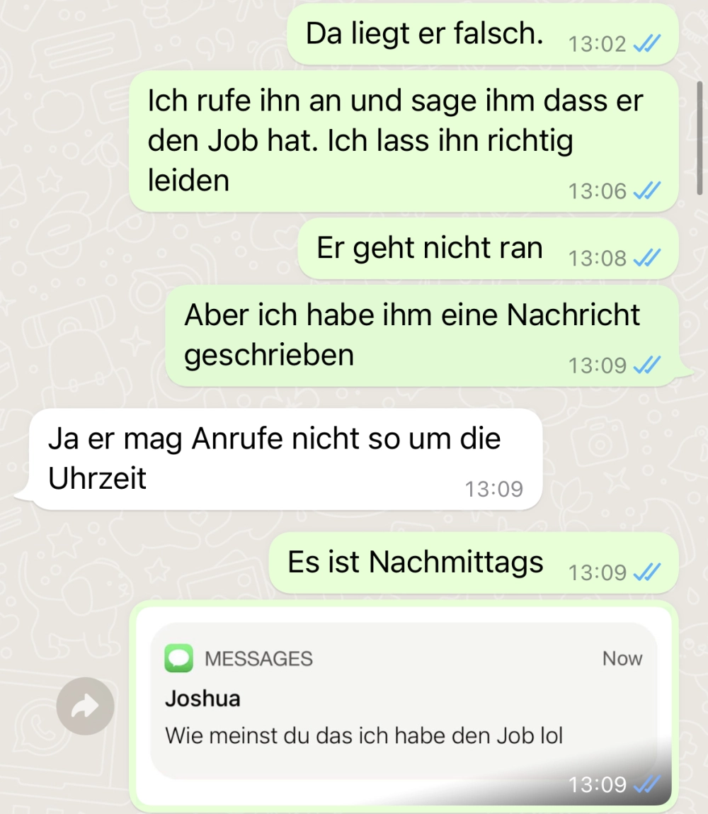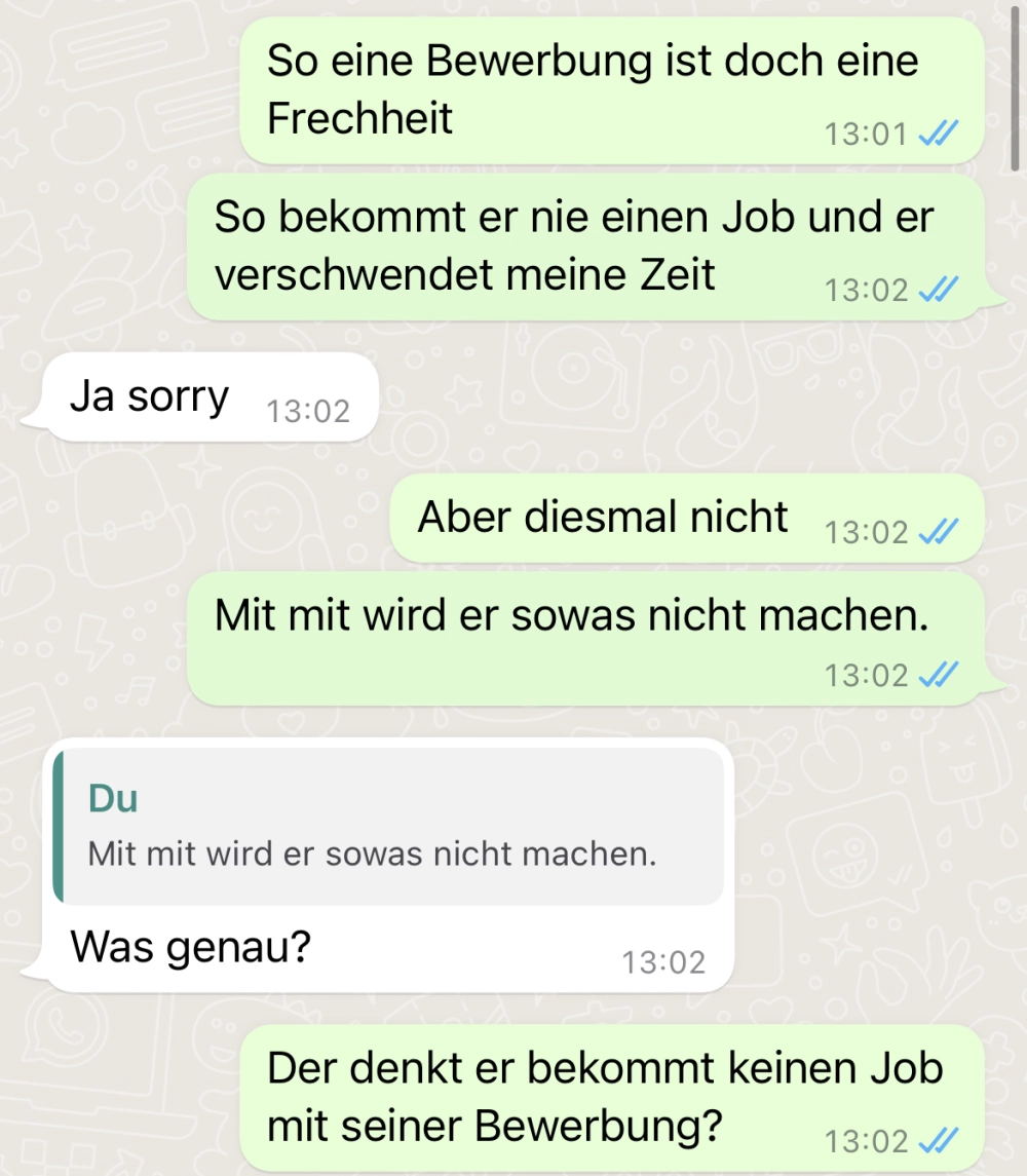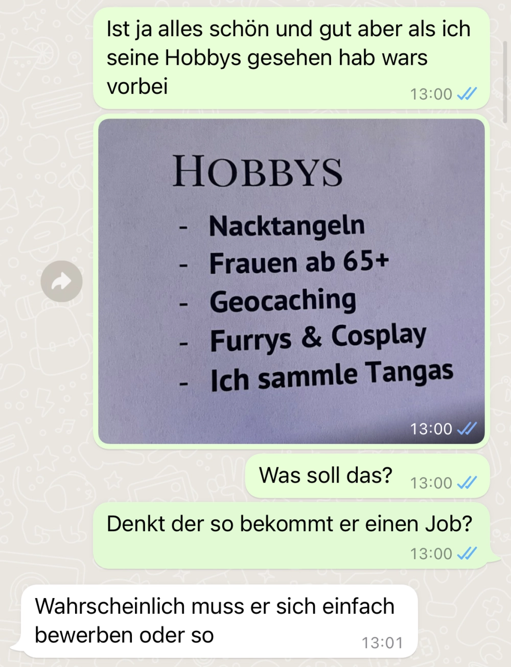 Eine ganz spezielle Bewerbung Von donscap Veröffentlicht 09.11.2021, 13:01Wen man bei sich einstellt sollte man sich gut überlegen. Doch die beiden haben sicher nicht erwartet, dass der jeweils andere so hartnäckig ist. Trotz diesen Hobbies kommt er ziemlich weit.Tags:chatverlaufsmswhatsappbewerbungWhatsAppE-MailLink