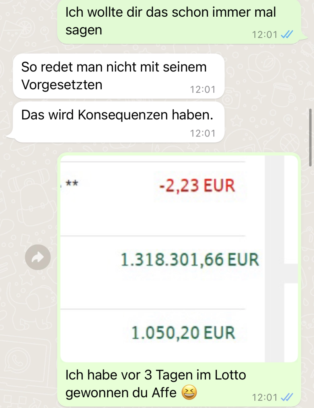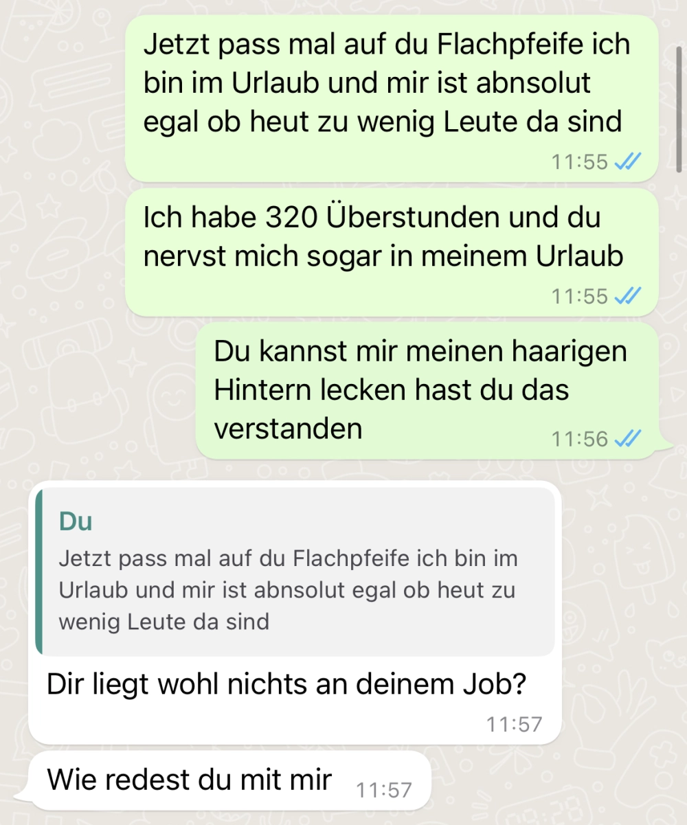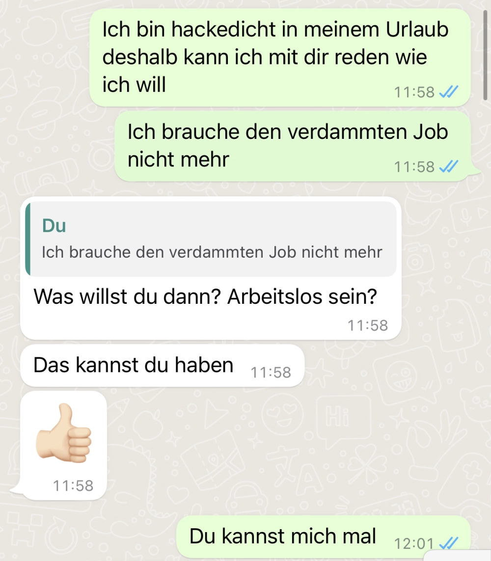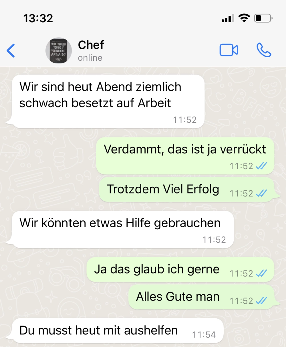 Das war sein letzter Arbeitstag Von donscap Veröffentlicht 10.11.2021, 12:48Er hat wirklich keine Lust darauf heute auf Arbeit zu gehen aus einem ganz bestimmten Grund. Doch letztendlich wird er seine Entscheidung noch bereuen. Wäre er mal netter zu seinem Chef gewesen!Tags:chatverlaufchatchefmsWhatsAppE-MailLink