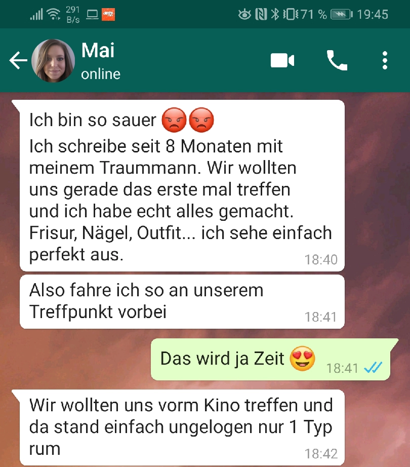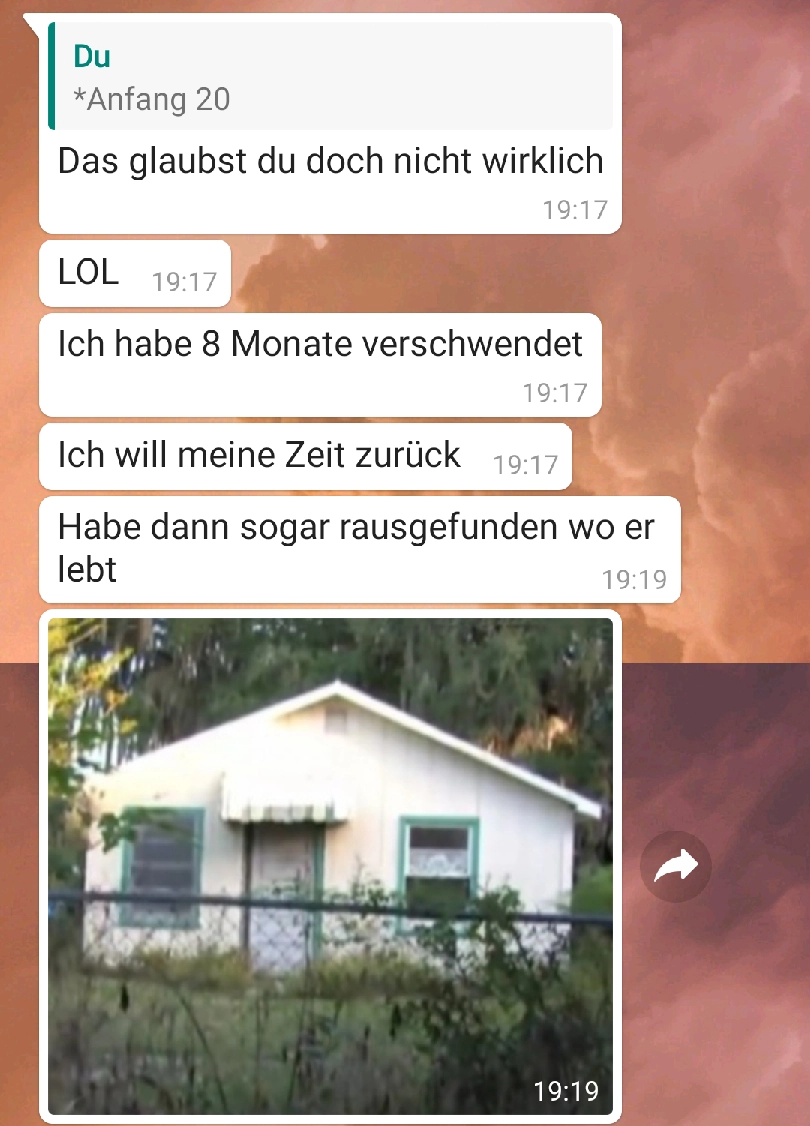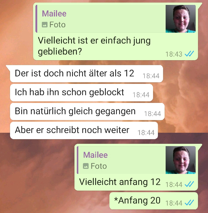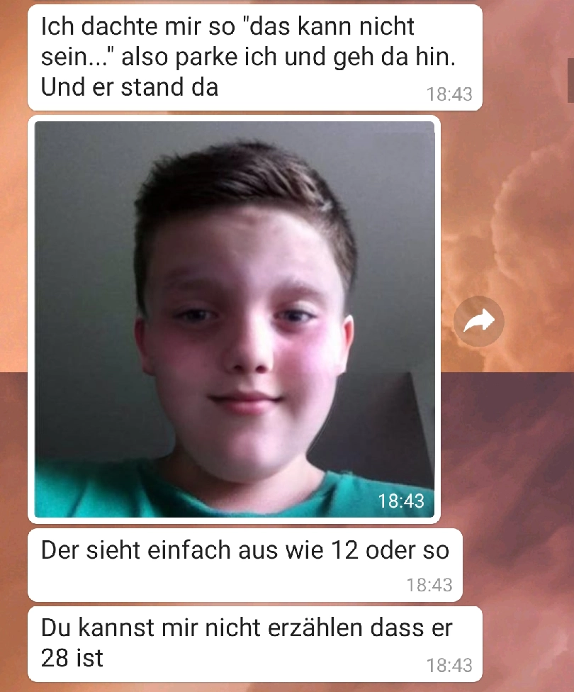Er ist irgendwas zwischen 12 und 32 Von donscap Veröffentlicht 12.11.2021, 16:11Eigentlich kann man das Alter recht gut einschätzen, aber bei ihm sieht das irgendwie ganz anders aus. Ist er jetzt 12 oder über 12? Wieso sollte er lügen, wenn er wirklich so jung ist...Tags:whatsappchatverlaufchatmsWhatsAppE-MailLink