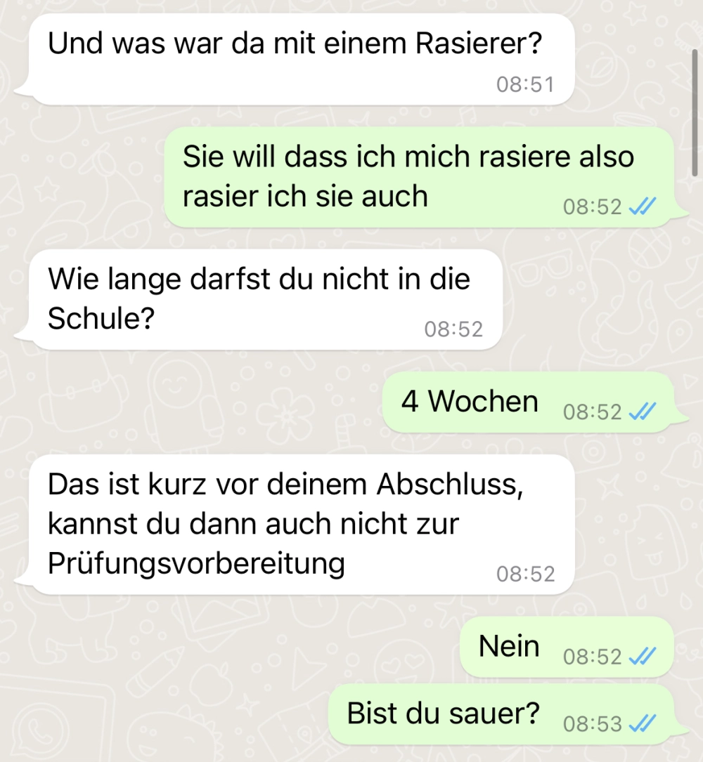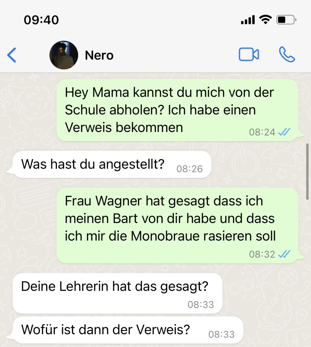 Sie hat ein Problem mit seinen Augenbrauen. Der Verweis war vielleicht gerechtfertigt, doch ihr Verhalten geht ja auch gar nicht. Sie haben beide so einiges falsch gemacht, besonders am Ende kommt das wahre Gesicht zum vorschein.