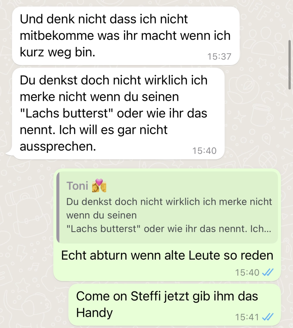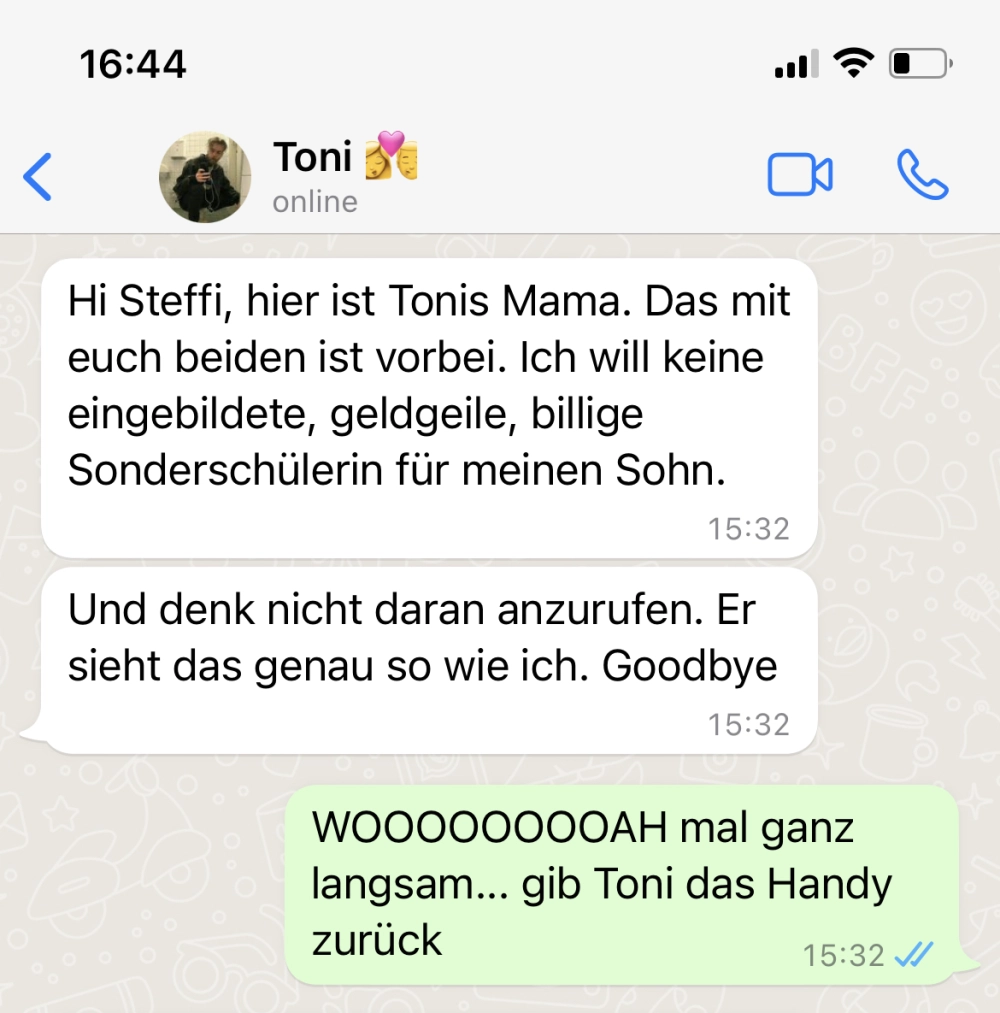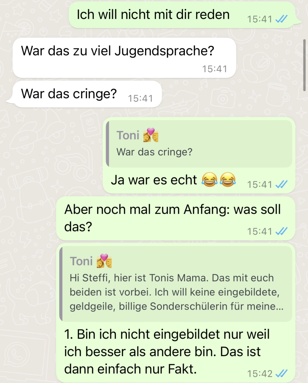 Sie muss anscheinend erst an der Schwiegermutter vorbei. Doch die beiden mögen sich absolut nicht. Es wird schlimmer und schlimmer, wahrscheinlich kann sie gar nichts sagen was ihr gefällt. Wenn man jemanden einfach nicht mag, dann bleibt das wohl so. Der arme Typ kann einem nur Leid tun, was er wohl mit ihr ertragen muss 😂