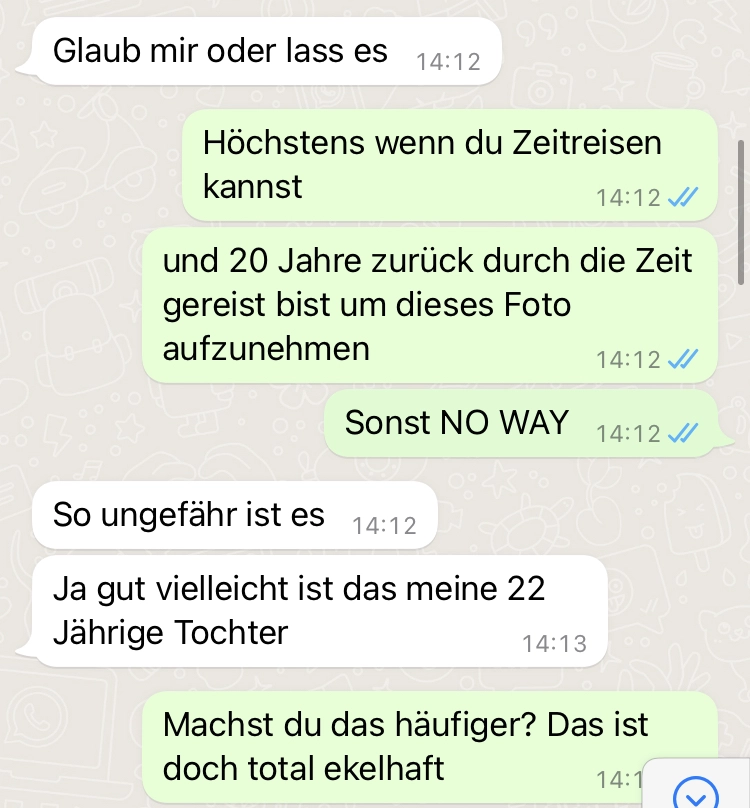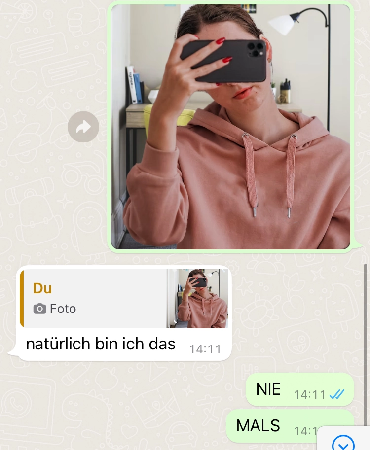 Plötzlich sieht sie ganz anders aus Von donscap Veröffentlicht 22.11.2021, 17:35Es ist nicht so wie es scheintManchmal ist alles ganz anders, als man denkt. Makeup, Filter etc. können alles ändern. Doch was wenn sie sich für eine komplett andere Person ausgibt?Tags:whatsappchatverlaufselfieWhatsAppE-MailLink