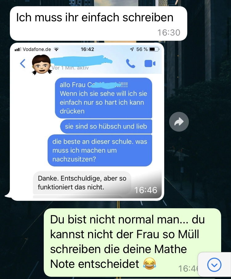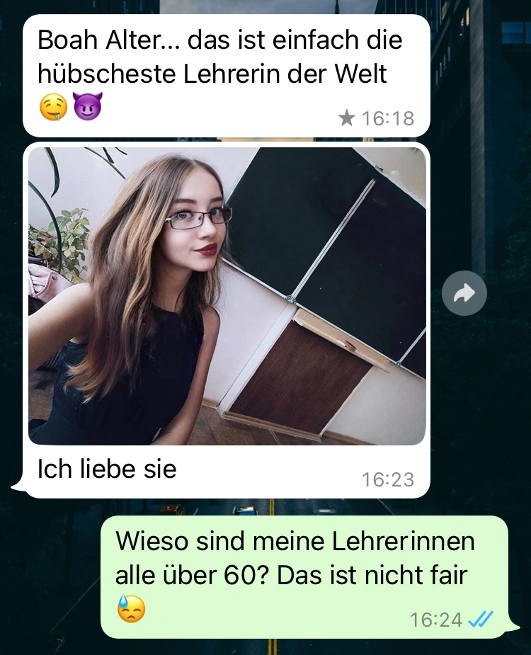 Also meine Lehrer wahren immer älter als 60 Jahre. Ich wusste gar nicht, dass es die auch in jung gibt 🤣 auf jeden Fall sollte man sich echt zusammenreißen und sowas nicht seiner Lehrerin schreiben. Jedenfalls nicht, wenn man nicht von der Schule fliegen will.