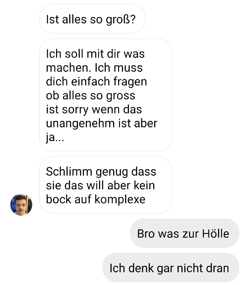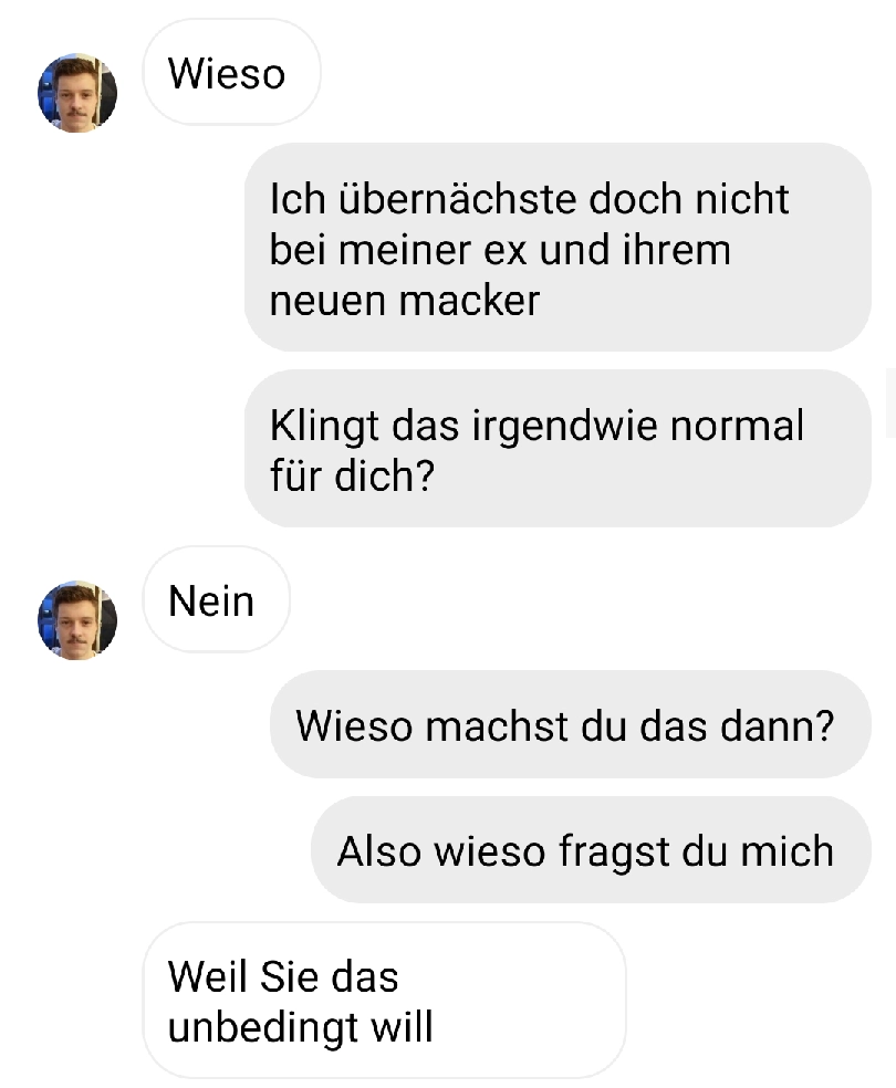Wie kann man sowas nur verlangen Von donscap Veröffentlicht 03.12.2021, 15:31Wie kann man sowas nur verlangen?In einer Partnerschaft sollte man schon darauf achten, was der Gegenpart so will und was nicht. Sowas zu verlangen kann doch nicht gut enden.Tags:instagramdmliebechatWhatsAppE-MailLink