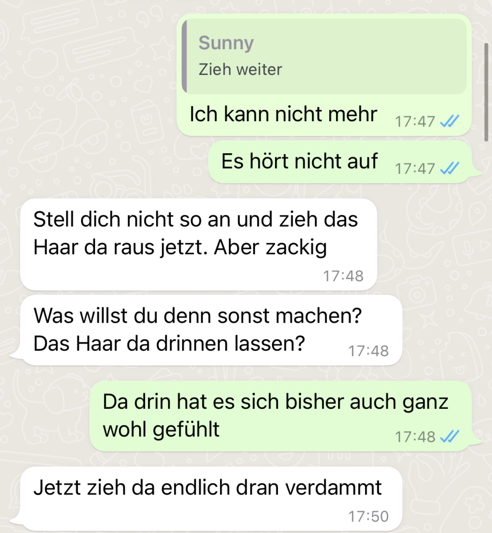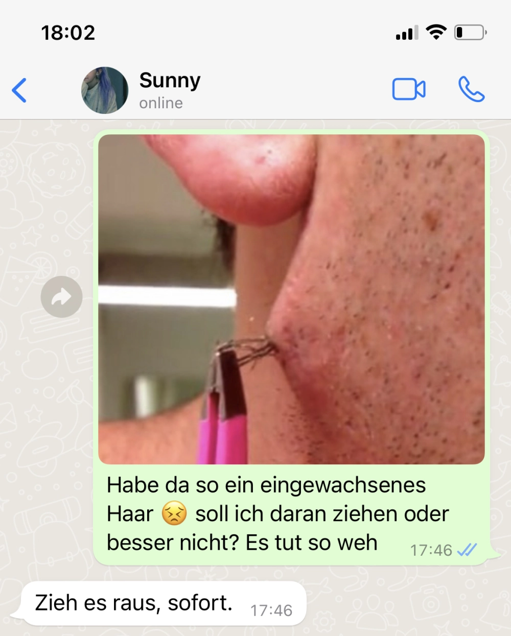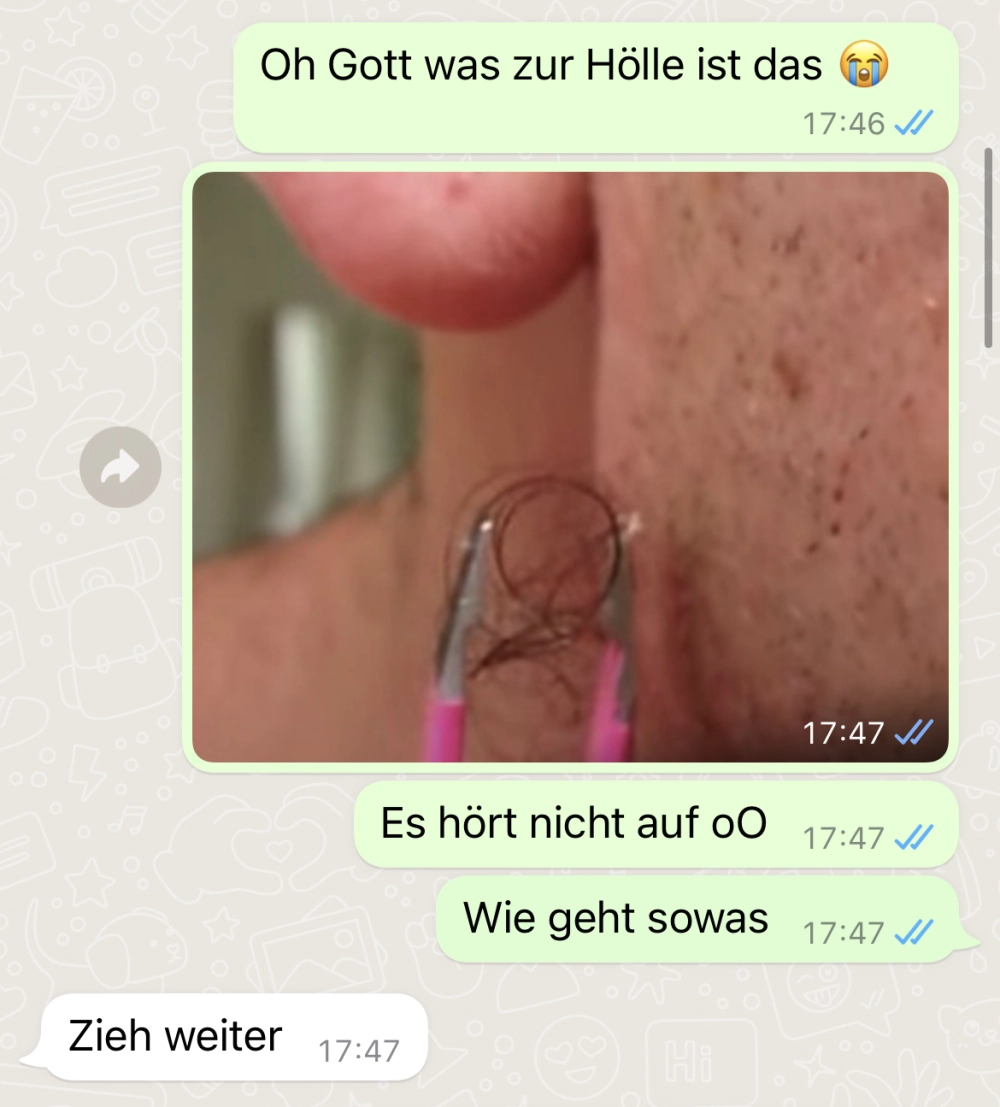Sowas sieht man echt nicht oft Von donscap Veröffentlicht 03.12.2021, 17:18Dieses eingewachsene Haar ist echt rekordverdächtig.Würdet ihr daran ziehen, oder was anderes machen? Echt schwierige Entscheidung wenn man bedenkt, was er noch so damit macht später 😀Tags:chathaargesichteingewachsenWhatsAppE-MailLink