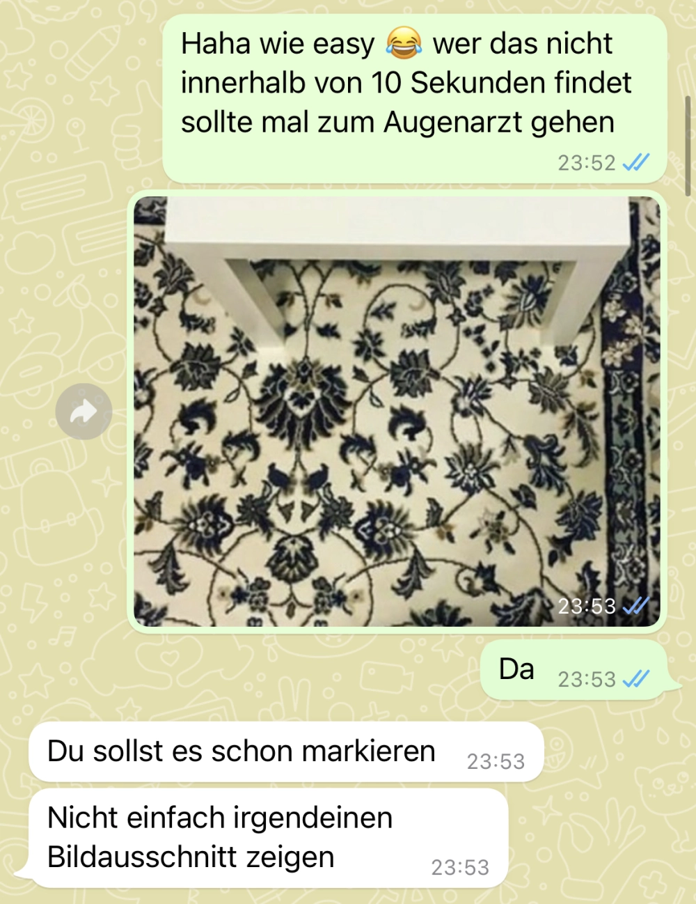 Doch das stellte sich schwieriger als gedacht heraus. Nur die besten sehen es sofort, obwohl es so offensichtlich ist. Wie lang habt ihr dafür gebracht? Alle unter 5 Minuten sind Profis!