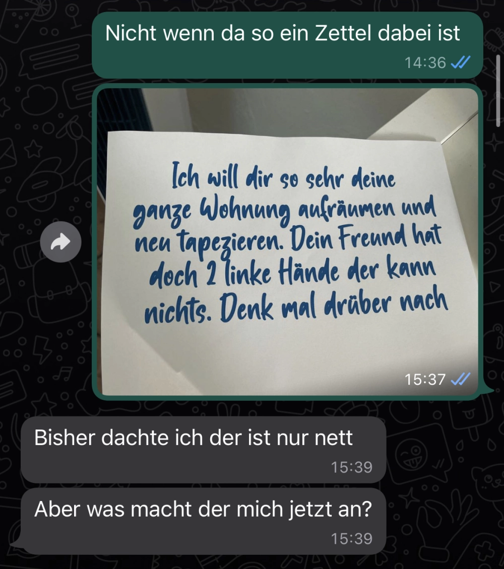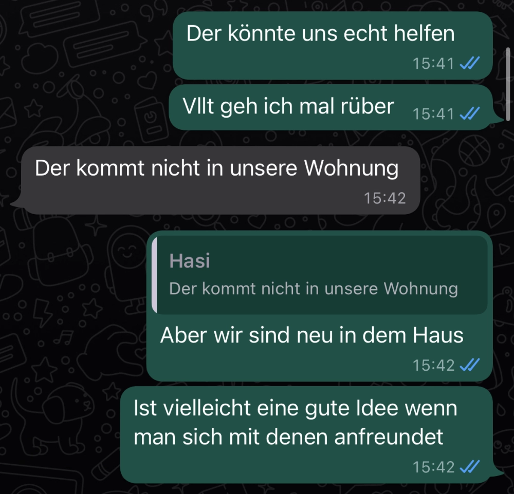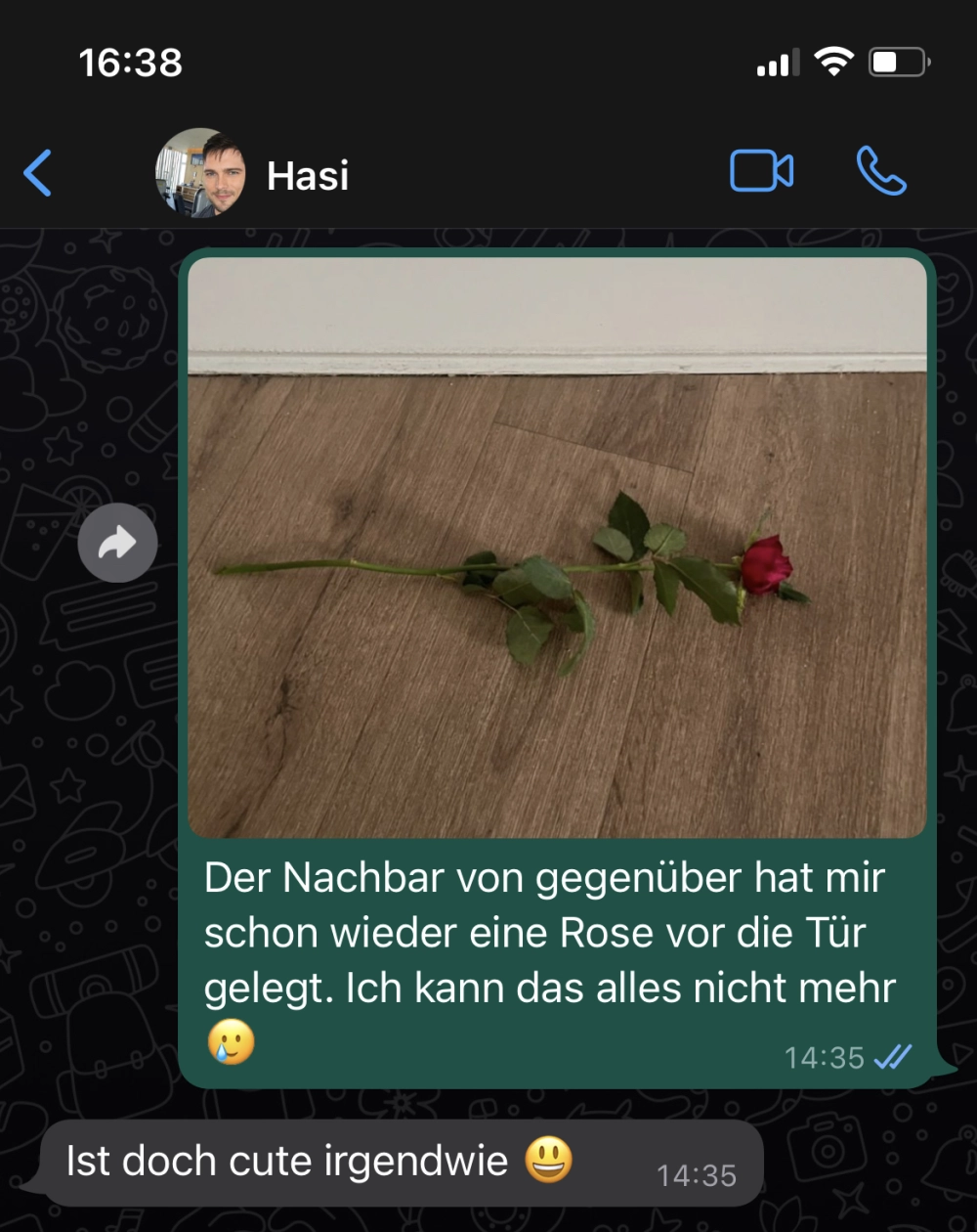 Der Nachbar mit der Rose Von donscap Veröffentlicht 09/15/2022, 2:52 PMDer Nachbar mit der RoseWie soll man reagieren, wenn der Nachbar täglich eine Rose vor deine Tür legt... wenn er weiß, dass da ein Pärchen wohnt ist das schon unangenehm 😂Tags:chatWhatsAppE-MailLink
