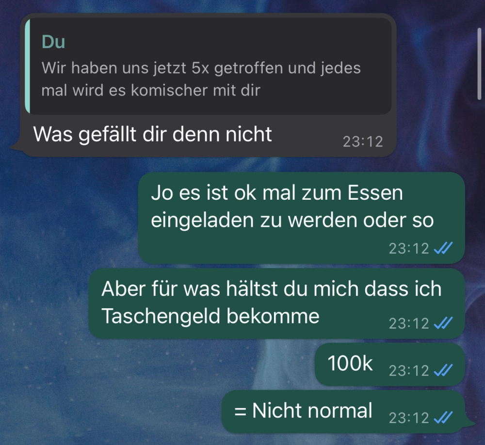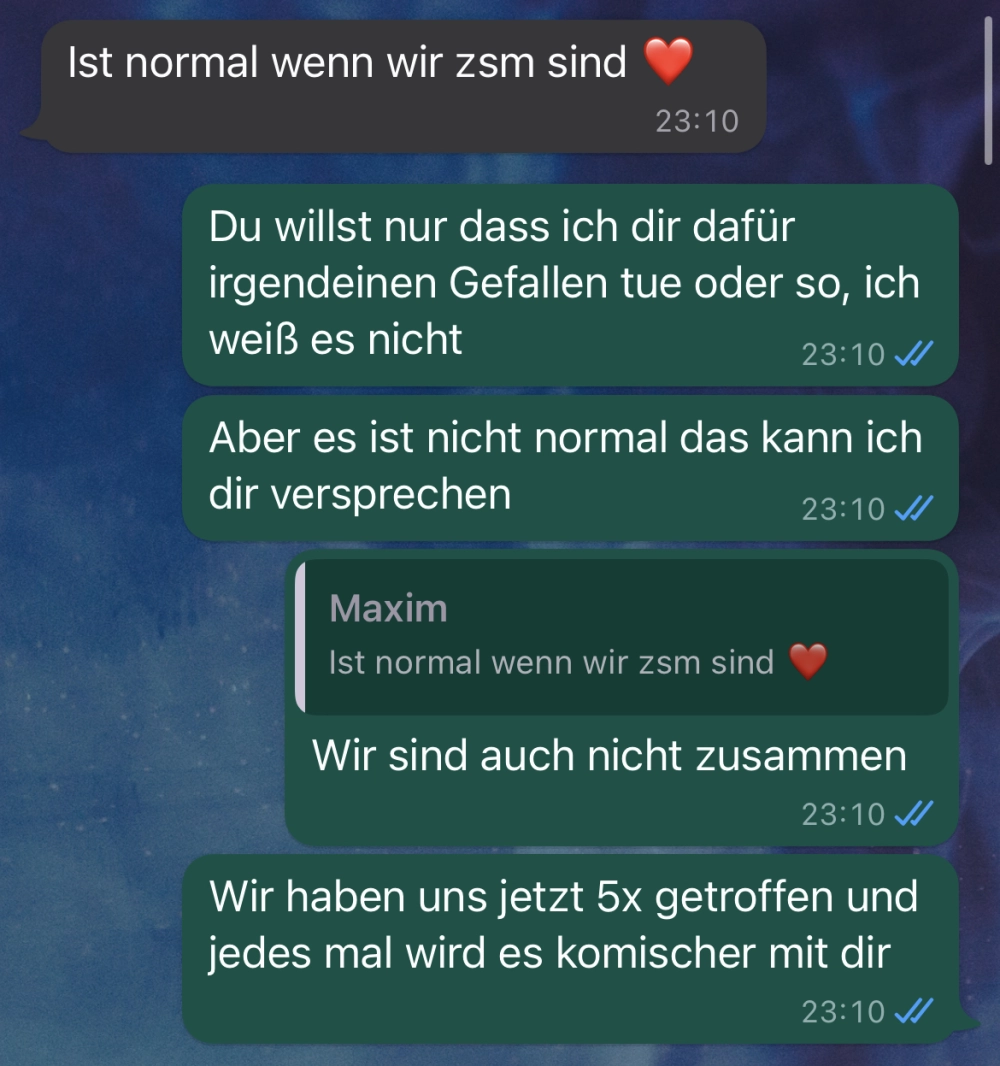 Sie sind noch nicht mal zusammen Von donscap Veröffentlicht 09/18/2022, 10:33 PMSie sind noch nicht mal zusammenEcht bisschen früh für sowas. Selbst wenn man zusammen ist, ist das doch nicht normal. Oder wie seht ihr das? Mir wäre das suspekt in der Kennenlernphase. Tags:chatWhatsAppE-MailLink